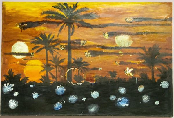 Editor: So this is "Marinha," a painting, likely in acrylic, by Aldemir Martins. It has a rather charming, naive quality to it, doesn't it? Those simple palm trees... what strikes you about it? Curator: What's fascinating is the labor evident in its making. It embraces the material qualities of acrylic paint, avoiding illusionism. Look how flat those planes of colour are. What assumptions do we bring when judging it "naive"? Does it invite an awareness about how paintings are manufactured commodities as well? Editor: I see what you mean. The flat application and bold outlines really draw attention to the paint itself, rather than any illusion of depth. Is it challenging our expectations of painting? Curator: Precisely. How does Martins subvert established ideas about artistic skill by rejecting painterly techniques and using accessible materials? The work becomes more about process than refined execution, potentially questioning the perceived value assigned to traditional oil painting versus acrylic, right? Editor: So, instead of seeing a simplified landscape, we're actually invited to think about the whole system of art production, value, and the materials that make it all possible? Curator: Exactly! Furthermore, consider what kind of "tropical" imagery Martins delivers and to whom. The painting perhaps critiques our relationship with "tropical" landscapes in a commercial setting, almost souvenir-like... Editor: Wow, I never considered all that. It definitely gives me a completely different view of what "Marinha" is all about! Thank you for shedding light on materials and modes of production that shape our interpretation of this naive tropical scene! Curator: My pleasure. It's about noticing how much the choices made about materials, application, and accessibility truly affect what a work means, beyond mere subject matter.