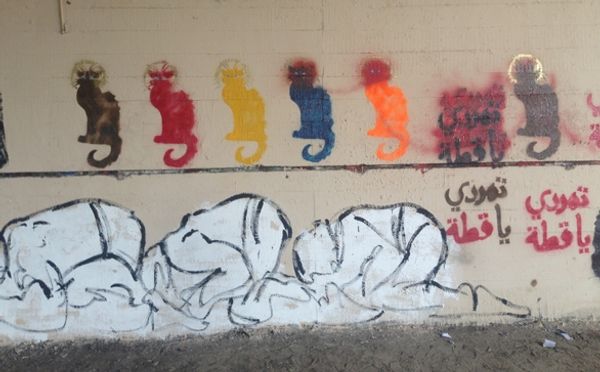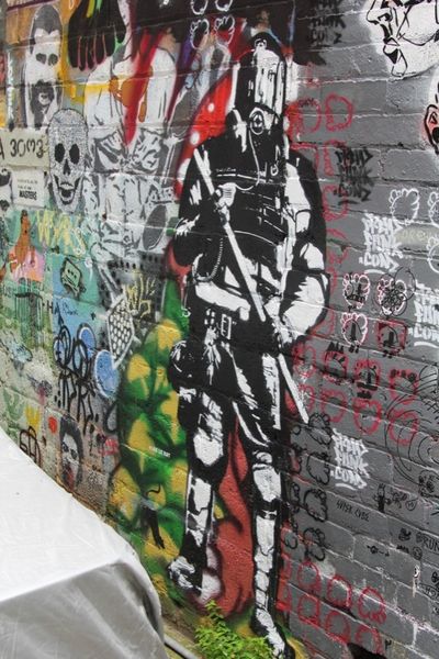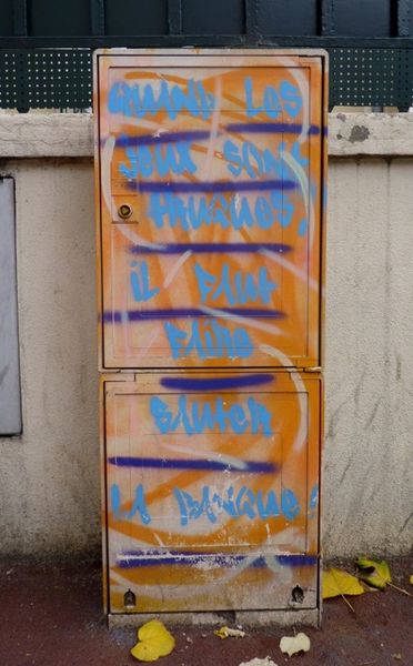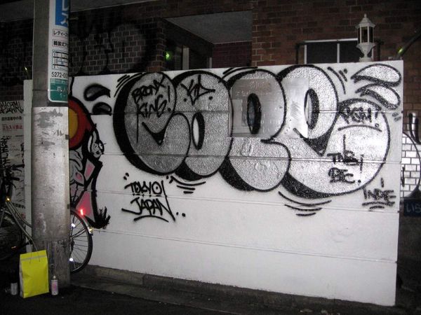 Editor: This is "Bomb", a graffiti piece. Unfortunately, the date is unknown, but the artist used acrylic paint. I am really interested by the layering, as if we’re seeing something emerge right before our eyes. How would you analyze its visual construction? Curator: A most astute observation! Notice the relationship between figure and ground. The yellow form pushes forward, but the concentric layering and gradations around each letter keep our eyes oscillating between foreground and background. Do you see how the dynamism inherent in street art translates to visual instability here? Editor: Absolutely, the curved shapes against the brick also create an interesting contrast of texture, which seems key here. The urban background acts almost as a canvas in itself! Can you say more about the importance of this relationship between support and figure? Curator: Indeed. The materiality of the wall anchors the ephemeral nature of the spray paint, giving a sense of context. Further, consider how the formal qualities of graffiti disrupt the geometry and grid of the wall, injecting vitality and movement into an otherwise static surface. Note the visual play of line and shadow that reinforces depth and three-dimensionality, despite the flatness of the wall itself. Editor: This has certainly given me a new perspective to appreciate not just the style, but also the artistic decision-making behind these artworks. I'll never look at a tagging the same way! Curator: Agreed, seeing graffiti beyond just lettering into the interplay of elements truly highlights the mastery of their creative act.