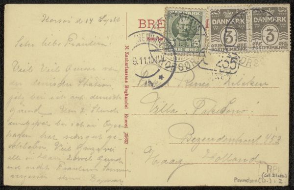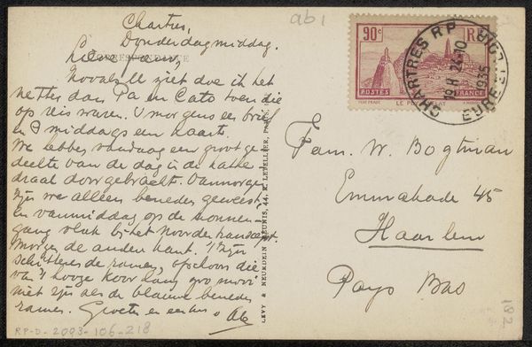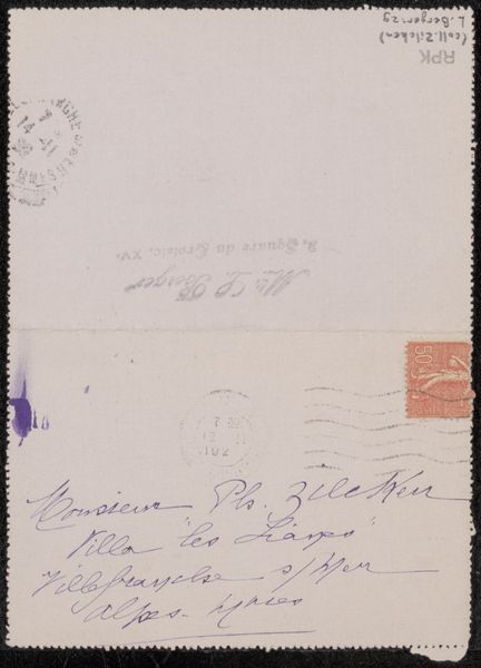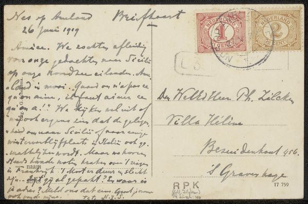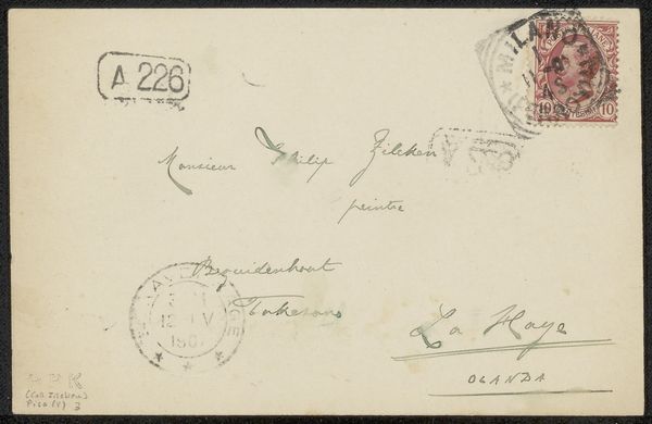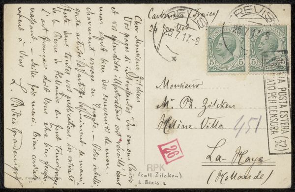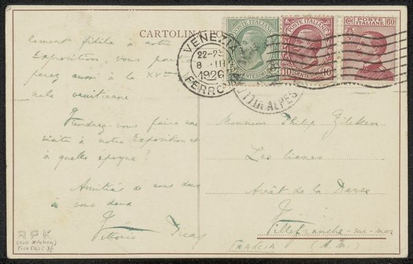 This postcard to Philip Zilcken was written by Vittorio Pica, a prominent art critic, likely in the late 19th or early 20th century. The humble materiality of the card itself speaks volumes about the era's burgeoning postal system, an innovation that democratized communication. The handwriting in light green ink, stamps, and postal markings all contribute to its textural richness. These elements show how the work’s function, as a simple everyday means of communication, influences its appearance, imbuing it with cultural significance. The card’s journey – from sender to recipient – involved a network of labor: from postal workers to transportation systems. This highlights the amount of human effort embedded in even the simplest of objects. It’s a reminder that even seemingly mundane items carry within them a complex web of social and economic relationships. The postcard, a simple everyday item, can be elevated to a piece of art when viewed through the lens of its materiality, production, and consumption.