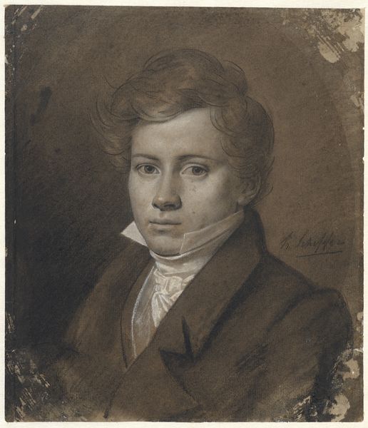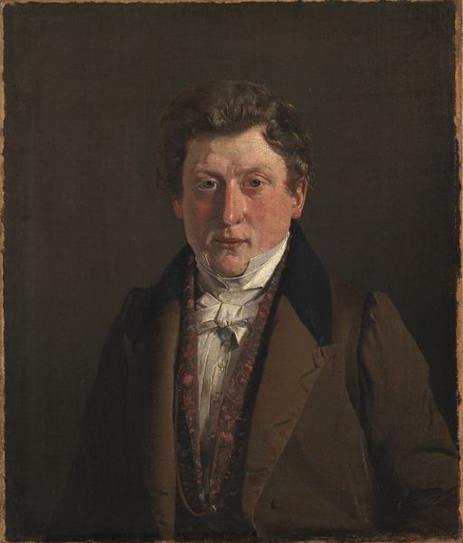 Curator: Before us hangs "Jacob Jurriaan de Friderici," an oil on canvas portrait completed before 1860 by Nicolaas Pieneman. The work is currently held here at the Rijksmuseum. Editor: My initial impression is a study in controlled power. There's a somber intensity to his gaze, which dominates despite the darker hues. It suggests a personality deeply entrenched within societal structures. Curator: Indeed, Pieneman, who worked in the Romantic style, frequently focused on historical depictions and portraits of prominent figures. This work, representative of academic art, captures more than mere physical resemblance. Consider the implicit narratives woven into the piece, with symbolic weight subtly implied. Editor: The man's assuredness is visually constructed; I'd guess it speaks to the specific societal role assigned to men during this historical moment. His attire— the high collar and dark overcoat—seems less a matter of personal taste and more a signifier of societal rank and power. Curator: That black coat absorbs a lot of the light in the painting, yet his face is brightly illuminated. We focus our immediate attention on the sitter’s personality, despite his garb conforming to established expectation. Even his hair seems consciously arranged. Editor: Precisely. We should also think about the cultural framework and societal privileges granted to the sitter as a white man, no doubt a member of the wealthy Dutch upper class, which undeniably shapes the representation itself. Even now, that constructed history informs our perception. Curator: I’d say it's not just a social construction but an intentional assertion of identity through visual language, one layered in implicit narratives and familiar tropes that an audience of that time would quickly understand. Consider that for generations images played the important role of defining social standing. Editor: And images like these still wield influence, albeit perhaps in subliminal ways. Deconstructing them exposes the ways such compositions might re-inscribe old hierarchies of wealth and influence and invite critique and re-evaluation of societal norms. Curator: That opens fascinating questions about the role of museums, which often hold power to both display and interpret the very codes these portraits present. Editor: Well, precisely. By critically analyzing such artworks, perhaps we find ways to dismantle such antiquated frameworks while expanding modern audiences’ appreciation.