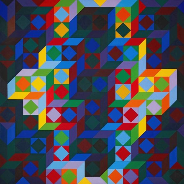 Curator: Welcome. Here we have Victor Vasarely's "Firaxo" from 1977, crafted using acrylic paint. It's a powerful example of his Op Art style. Editor: It's... disorienting! The patterns fight each other, making it hard to focus. It feels almost confrontational. Curator: Interesting. From a materialist perspective, Vasarely’s consistent use of acrylics allowed him to explore a smooth, even application of colour, crucial for achieving the illusion of depth and movement, don't you think? The surface lacks any obvious texture from brushstrokes. Editor: Absolutely. I can't help but think about the socio-political climate of the late '70s when this was made. The oil crisis, widespread social unrest – "Firaxo," with its unsettling visuals, seems to reflect the instability of the time. It embodies post-modern skepticism towards utopian visions. Curator: You’re highlighting its potential commentary. Op Art, however, moved away from direct political commentary, choosing instead to explore perception and how our eyes interpret visual information through simplified processes and geometry. Editor: But that removal IS the statement, right? Escapism, perhaps? Mass production and consumption, all those neat little checkerboard boxes remind me a bit of suburban conformity gone awry. Are those allusions just my projection? Curator: The painting technique itself embodies industrialized approaches by minimizing traces of the artist’s hand to produce sleek lines and colors for a consumerist audience eager for something 'new' from their factories during a moment of growing economic change worldwide. Editor: It’s almost architectural, too—a distorted urban landscape perhaps, one designed to both attract and alienate? How do the illusions of space engage or even confront viewers? Does the repetitive motif indicate labor, perhaps, an infinite factory churning out identical modules? Curator: One might interpret that within "Firaxo’s" aesthetic—Vasarely wasn't simply generating optical trickery. He engaged deeply with industrial methods and his artworks served in ways for democratizing the concept for fine art so the piece becomes not just decorative but something reproducible for design. Editor: Precisely. This makes it something everyone can own regardless their socioeconomic background by bringing abstract concepts straight into homes with consumer goods; challenging how art and decor influence class consciousness and material aspiration through accessible consumption. Curator: Yes, this changes my thinking and reveals new meanings, indeed. Editor: Same here. It is difficult to perceive something objective—so many different cultural associations change the material object completely!