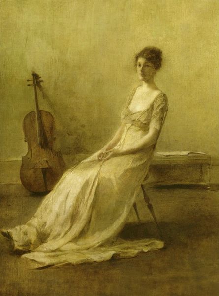 Thomas Wilmer Dewing painted this girl with her lute probably sometime in the late 19th century, and honestly, the blurry edges make me think of my own painting process: layering, scraping, and searching for form. Look at how the color is scrubbed in, like he’s wiping away as much as he’s adding. Her dress is barely there, all these shimmering strokes suggesting folds and fabric, but never quite resolving. It’s like a memory of a dress, not the thing itself. And the way the rug is painted is incredible; so much energy in the marks that almost obscure any sense of depth or space. See that dark slash of green, right at the front? It’s so bold and assertive, it practically vibrates! It reminds me a little of Whistler, this interest in mood and atmosphere, but Dewing has his own thing going on. It's like he's trying to capture the feeling of music, not just the image of a girl playing an instrument. It’s ambiguous, and that's what makes it interesting.