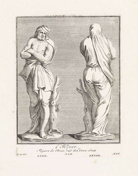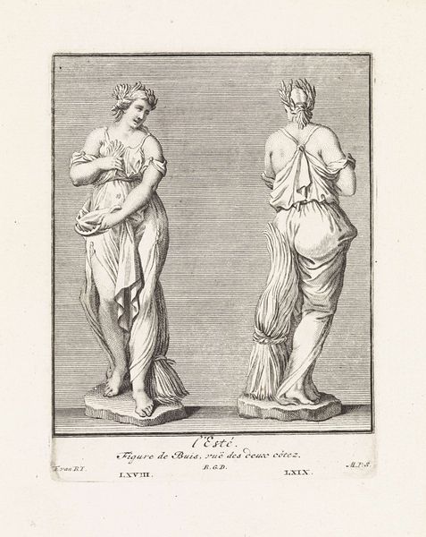 Editor: This is "Voor- en achteraanzicht van een Venusbeeld," from around 1700. It's an engraving of a Venus statue, credited to Maria de Wilde. What strikes me is the almost clinical way she's presented – front and back, like a specimen. How do you interpret this work? Curator: I see this print as an act of documentation firmly rooted in material conditions. Wilde's engraving isn’t just replicating a statue; it's engaging in the social circulation of classical ideals through reproducible media. The print *is* the object, democratizing access to 'high art' beyond the elite who could afford the sculpture itself. Consider the labor involved: the skilled hand of the engraver meticulously translating three-dimensional form into a two-dimensional print. The Latin text, too, what’s its function here? Editor: So, it’s not about the beauty of Venus, but the process of making art accessible? I mean, the text almost feels like scientific labeling... Curator: Precisely! The act of reproducing classical art democratized knowledge. Each print became a tool. Where was it distributed? Who owned this print? These questions reveal how knowledge, status, and classical ideals are packaged for consumption during that period. And further, what is the material process that makes such a transfer possible? Editor: I hadn't considered it that way before. So, by examining the printmaking process, we understand how art functions within society beyond aesthetics. Thanks, this was insightful. Curator: And by understanding distribution we further realize that “high” art does not exist in isolation but becomes so through use of base materials and labour. Fascinating isn’t it?