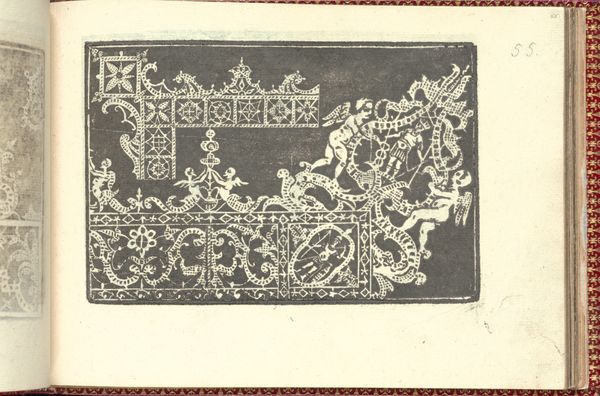 This is page 38 from "Corona delle Nobili et Virtuose Donne," a book of lace patterns created around 1591 by Cesare Vecellio. The piece presents a striking composition, using stark black ink against the white of the page to create a rhythmic and decorative design. The image is structured in horizontal bands, each filled with symbolic and stylized motifs. The upper register features floral and serpentine forms, while the lower band is populated with creatures like rabbits, birds and sirens. These forms are contained within a geometric grid, adding a layer of structure to the organic shapes. Vecellio’s work operates within a semiotic framework, where each element—the animals, the flowers, the geometric shapes—functions as a sign. The repetition and arrangement of these signs create a visual language. The overall structure reflects the cultural interest in symbolism during the late 16th century, where pattern books not only served practical functions but also engaged with deeper cultural meanings. The artwork is a fascinating example of how form and function intertwine, offering insights into the aesthetic and intellectual values of its time.