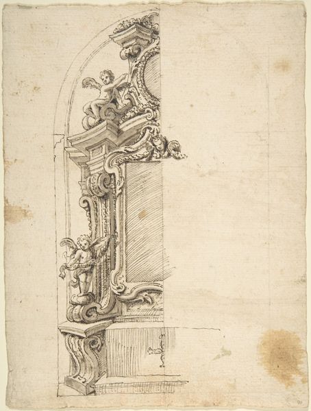 This is a pen and brown ink sketch of a design for a lectern, unsigned and undated. Note the prominent figure at the top, a seated man holding what appears to be a lyre. Such a figure suggests the importance of music or the spoken word. Throughout history, similar figures have appeared, often linked to Apollo, the Greek god of music and light, embodying the harmony and order that music brings. Yet, here, he seems almost introspective. Look at the cherubic figures and grotesque masks adorning the lectern’s base. This juxtaposition of the sacred and the profane is a recurring theme in art. The cherubs, symbols of divine love, contrast sharply with the grotesque masks, which represent primal, chaotic forces. These masks—echoes of ancient rituals to ward off evil—reveal a deep-seated human fascination with confronting and controlling the darker aspects of our psyche. It's a reminder of the enduring power of symbols and motifs to resurface and transform, resonating with us across centuries.