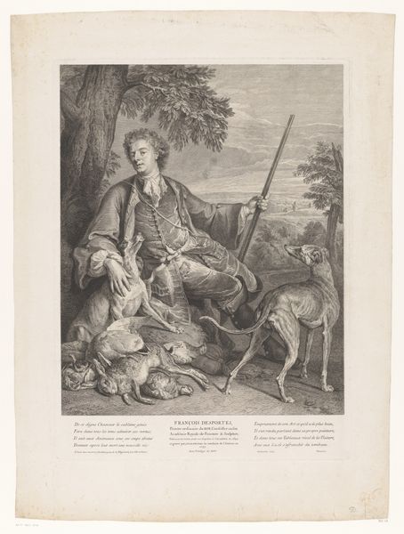 Editor: So, this is "François Desportes" by François Joullain. It depicts a hunter with his dogs, and it feels very staged, very posed. What strikes you about this piece? Curator: It feels a bit like theater, doesn't it? Desportes, the hunter, is almost presenting himself, more than the hunt itself. Look at the way Joullain uses light and shadow. It’s not just descriptive; it's dramatic. Editor: Almost as if he is showing off his status. I see that he seems very sure of himself. Curator: Exactly! Think of it as a visual resume, demonstrating skill, wealth, and cultural refinement. It also makes me reflect on the power of representation, who gets remembered, and how. Editor: I never thought of it that way, as a self-promotion piece. That adds a whole new layer. Curator: Yes, it transforms the meaning of the piece. We can appreciate not just the artistry, but the carefully constructed image.