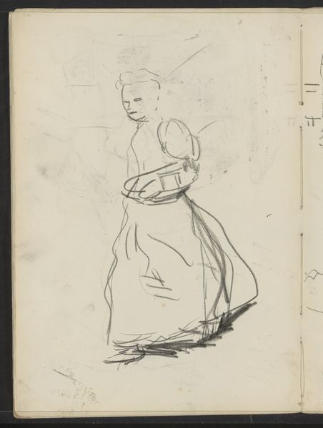 Curator: Breitner's sketch, titled "Waspit op de Lauriergracht te Amsterdam," dating from around 1895, offers a fleeting glimpse into Amsterdam life. It's currently held in the Rijksmuseum. Editor: It feels spontaneous, like a quickly jotted observation. I'm drawn to the simple lines; they convey a sense of immediacy and raw emotion. The texture of the pencil on paper really highlights its production. Curator: Absolutely. Breitner was known for capturing the everyday reality of Amsterdam, moving away from the romanticized views popular at the time. This sketch, with its focus on a solitary figure, offers a social commentary on the urban experience, especially how women navigated public space. Editor: Yes, and consider the labor embedded here. Sketchbooks themselves became affordable and readily available by the late 19th century. Breitner is engaging in a very new type of artistic practice centered on documenting his lived experience. We might compare it to the rise of documentary photography at the time. Curator: Precisely. It also begs the question of Breitner's motivations for depicting Waspit. Was he merely capturing a scene, or was there a deeper engagement with the social and political dynamics of the era? Breitner had an evolving but often ambivalent relationship to women, and he likely thought a great deal about their roles within his art as it developed in the public eye. Editor: You can almost feel the speed with which he worked to catch the light falling across the dress and the buildings in the background, however minimally defined they may be. Curator: A glimpse of everyday labor manifested as art... It does make you appreciate the fleeting moments that art can immortalize. Editor: Exactly, a great example of an artist capturing their impressions of labor in real time. Thanks for shedding light on that!