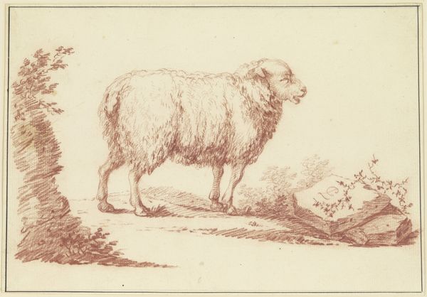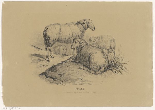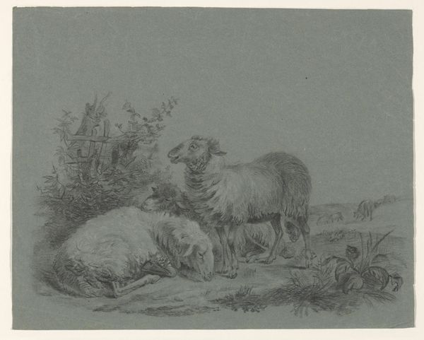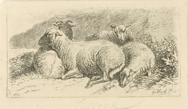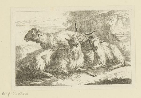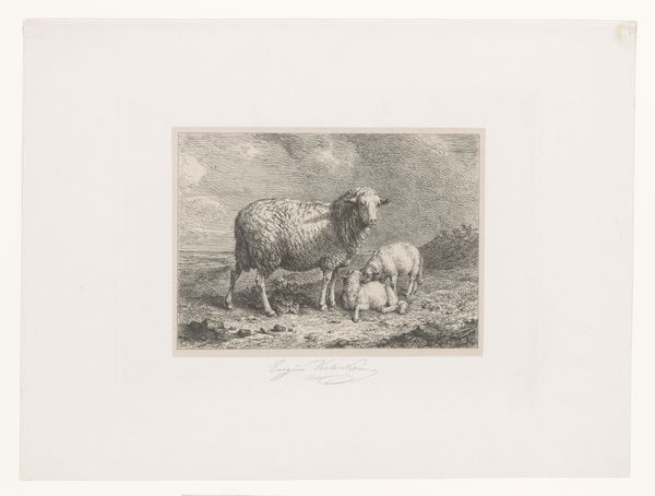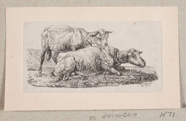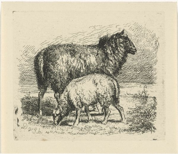 Editor: This etching, "Twee schapen in een weide met hekwerk," by Louis Robbe, dating from 1816 to 1887, depicts two sheep in a field. I find the scene very tranquil. What stands out to you about this work? Curator: Tranquility, yes, but also consider what rural scenes like this were meant to represent. In the 19th century, the romantic idealization of rural life often masked the harsh realities faced by agrarian communities. Does this etching reinforce a comforting narrative, or does it offer a subtle commentary on the relationship between humans, animals, and land ownership? How might ideas of labor and economic disparities filter into the representation of these sheep? Editor: So you're saying the simplicity of the image might be deceptive, hiding complex social issues? I hadn't considered it in terms of labor, or land ownership... Curator: Exactly. The presence of the fence, for instance, speaks to boundaries, enclosure, and control. Consider the implications of depicting animals within a contained space. How might this relate to broader conversations about freedom, confinement, and the commodification of nature, especially viewed through the lens of gender, race, and class dynamics? The sheep themselves—their wool, their meat—were valuable resources. Who benefited from those resources, and at whose expense? Editor: That definitely changes my perspective. I was seeing pastoral beauty, but now I see a loaded scene with potential for discussing exploitation. Curator: It's about critically examining what we’ve been taught to value and whose stories get told, or, in this case, etched into history. The romanticization of nature often occludes the complex realities of lived experience. Editor: I see what you mean. Thanks to this conversation, I feel like I'm not only looking at art but also looking *through* it.