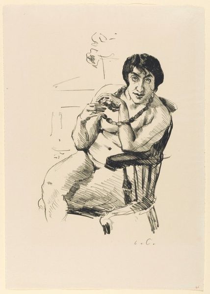 Curator: Lovis Corinth's "Self-Portrait with Male Nude" presents an intriguing juxtaposition of forms. Editor: It strikes me as quite a statement on the gaze, challenging the traditional power dynamic between the artist and the model. Curator: The composition utilizes a strong contrast between the detailed lines of Corinth's face and the more fluid rendering of the nude figure. Editor: It’s hard not to read this in the context of early 20th-century anxieties surrounding masculinity and artistic identity, particularly within the German Expressionist movement. The positioning of the figures creates a sense of unease. Curator: Absolutely, the careful arrangement of shapes and lines creates a dynamic tension. Editor: Ultimately, Corinth invites us to consider the roles of both artist and subject, engaging with themes of sexuality, representation, and the artist’s self-perception. Curator: A perfect encapsulation of artistic introspection through form.