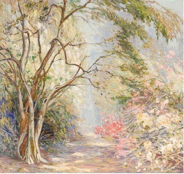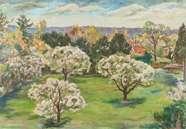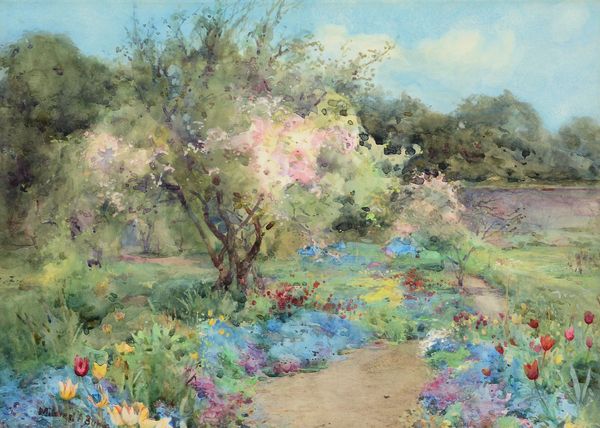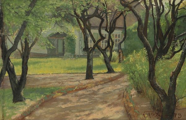 Editor: This is Duncan Grant’s "Garden Path in Spring," currently at the Tate. I’m struck by how the path draws your eye into the garden’s depths. What’s your interpretation? Curator: Considering Grant's Bloomsbury Group affiliation, this garden becomes more than just a landscape; it's a cultivated space, reflecting the group's aesthetic ideals and their social values. The path, almost stage-like, hints at performance and cultivated beauty. Editor: So, you’re saying the garden is a kind of stage for the Bloomsbury set’s ideals? Curator: Precisely. It makes you wonder about the relationship between the private gardens and the public image the Bloomsbury Group projected. Editor: I never thought of it that way. Seeing the garden as a reflection of their public role adds another layer to the painting. Curator: Indeed, it’s a garden of cultivated ideas, as much as cultivated flora.