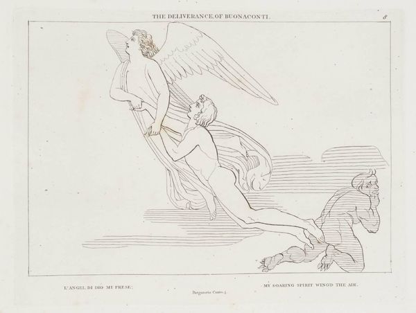 Editor: This is John Flaxman's "The Benediction," a monochromatic print. It looks like a boat filled with people being greeted by an angel. What do you see in this piece? Curator: The figures evoke a sense of collective vulnerability, doesn't it? Consider Flaxman's time. The Enlightenment’s ideals were clashing with social realities. How might this image reflect the era’s anxieties about power, salvation, and collective identity? Editor: I see what you mean. It’s not just a religious scene but a commentary on society. Curator: Exactly. Who is granted salvation, and who is left behind? Flaxman makes us question these power dynamics. I wonder, where does the image sit in relation to, say, abolitionist movements? Editor: I never thought of it that way. It gives the artwork so much more depth. Curator: Precisely. Art becomes a powerful tool when we examine its social and political undercurrents.