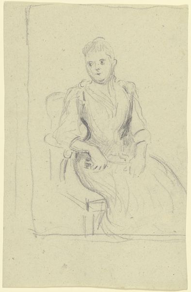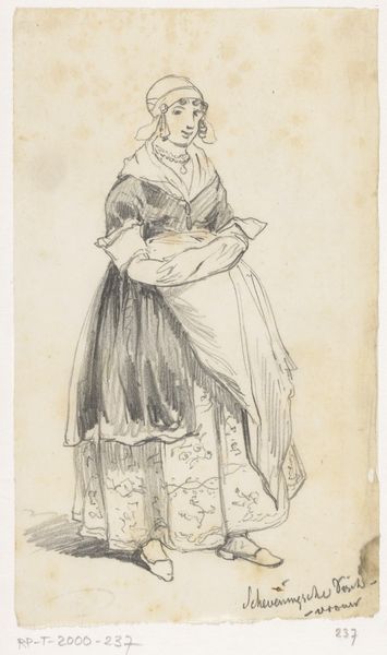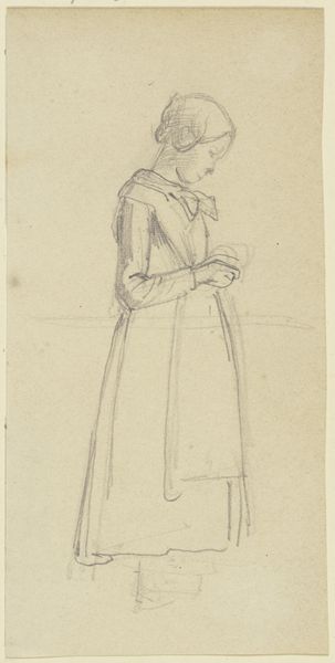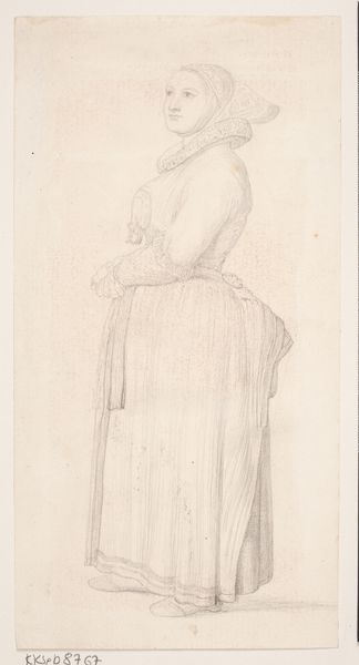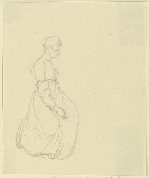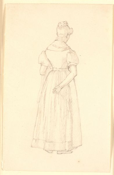 Editor: We're looking at "Stehendes Mädchen, die Hände in die Hüften gestemmt," a pencil drawing from around 1771-1772 by Georg Melchior Kraus. It depicts a young woman standing with her hands on her hips, and something about her pose reads as defiant. What do you see in this sketch? Curator: Well, this seemingly simple sketch speaks volumes about the changing social landscape of the late 18th century. It's not just a casual drawing, but reflects evolving ideas about class and representation. Notice how Kraus portrays her. Do you find that her dress is a depiction of a certain working class? Editor: It does appear rather modest compared to typical aristocratic portraits. Almost…genre-like. Curator: Exactly. Kraus is placing emphasis on the everyday person. What's really fascinating is understanding how this portrayal challenged the norms of artistic patronage and representation at the time. Aristocrats commissioned portraits celebrating power and status; what do you think it means when artists started looking elsewhere, to the ordinary for their subjects? Editor: It suggests a shift in artistic values, perhaps reflecting growing social consciousness or even critique. This also makes me wonder how the sketch functioned within Kraus's broader artistic practice. Curator: A fantastic point! Sketches like these weren't just preliminary studies but functioned as independent works capturing the spirit and mood of the subject, circulated among collectors who valued their spontaneity and authenticity. This helped him to build his reputation. It served a social function beyond just the visual itself. Editor: That provides a lot more context! I went into this only thinking it captured the energy of the subject. Curator: It’s a testament to how art, even a simple sketch, can become a fascinating window into understanding broader historical shifts. It’s taught me the role art played during times of shifting power.