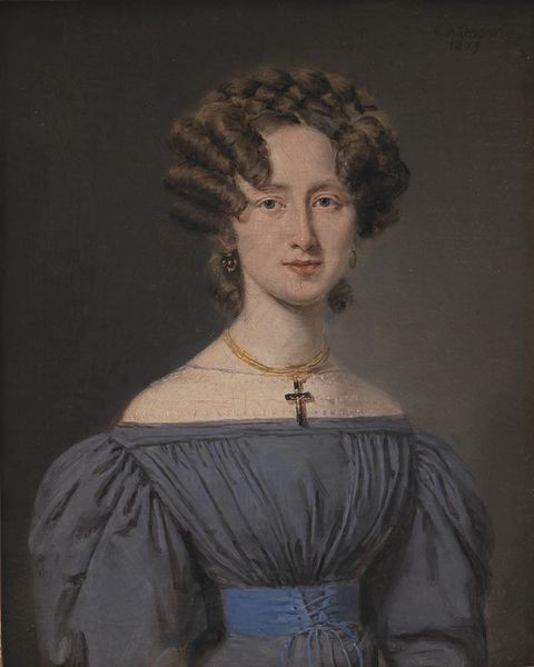 Editor: We’re looking at “Sophie Stramboe,” an oil painting from around 1830 to 1840 by David Monies, currently housed in the SMK. There's something so serene and balanced in this portrait, yet the dark background makes it feel slightly melancholic. What stands out to you about this piece? Curator: The most immediate element is the interplay of light and shadow. Notice how the artist uses a limited palette to create depth. The stark contrast between the dark dress and background, and the illuminated face and delicate lace details, is striking. It directs the eye and structures our engagement. Editor: That’s true; I hadn't considered how the composition draws the eye. The lace collar is very delicate but does its placement create any visual tensions? Curator: Indeed. Consider the geometry inherent in the portrait: the triangular form created by the shawl mirrored, to a degree, by the arrangement of the face and bonnet. There's a push-pull happening. Also note the quality of the brushstrokes; smooth in some areas, slightly more textured in others, especially around the edges of the lace. This contrast creates dynamism. What kind of mood would you say is created? Editor: I can definitely see how the textures play against each other. Thinking about mood, I feel drawn to the subtle details of her facial expression. And so even with what might be perceived as ‘melancholy’ I am compelled to engage and learn. Thank you for opening up this portrait for me. Curator: The power of close observation reveals new ways of understanding. By looking at art, you're deciphering a system of visual signs and appreciating its inherent order.