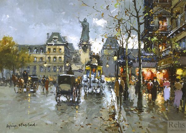 Curator: We’re now looking at Antoine Blanchard’s painting, "Place de la Republique." Blanchard, known for his cityscapes, particularly of Paris, really captures a moment here with his oil paint. Editor: The mood is undeniably melancholic. There's a soft grey tonality overall, but then you get these surprising flashes of warm, golden light spilling out from the shops, reflecting in the wet streets. It's a visually interesting contrast. Curator: Absolutely. The contrast also highlights the material reality of Parisian street life at that time. Consider the carriages; each one assembled piece by piece in workshops, representing labor and skill. The people are shown doing commerce and leisurely stroll, key actions related to labor division and class. Editor: From a formal point of view, observe how Blanchard uses loose brushstrokes to create the illusion of movement, of bustling city activity. And the verticality of the buildings, balanced by the horizontal lines of the street, gives a nice sense of depth to the composition. Curator: And don't forget that choice of plein-air as medium: taking the studio out onto the street allowed a truer depiction of light, atmosphere and of the actual circumstances surrounding these individuals' routines. Editor: Yes, and the atmospheric perspective definitely pulls your eye toward the monument in the distance, a symbol perhaps of permanence amidst all this fleeting activity, however it has its form blurred so it blends well. Curator: What fascinates me is thinking about how Blanchard positioned himself within a specific economy; both the economy of painting and the specific Parisian economy he's depicting. Think about his patrons, the collectors and what their aspirations were. Editor: Indeed. Seeing this painting I start thinking of semiotics, how buildings, even streets and squares are loaded with signifiers about a city's ambitions and also the aspirations of their patrons, even a nation. Curator: Ultimately, what’s being bought and sold extends beyond a material object, into social aspirations, Parisian culture, perhaps even dreams. Editor: It really does go both ways, doesn't it? We've seen a city scene, captured with loose strokes of color. But understanding some of that original setting allows us to now interpret these structures of signs.