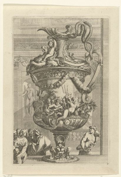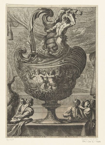 This print depicts a ewer, a large pouring vessel, adorned with a scene of Neptune. It was made by an anonymous artist through the etching process. In etching, a metal plate is coated with a waxy ground, and then the artist draws through the ground with a needle, exposing the metal. The plate is then immersed in acid, which bites into the exposed lines, creating an image that can be printed. The artist has managed to make a very convincing copy of the ewer, complete with the textures of the metal. What is remarkable is the detail of the original object: note the way that the various mythological figures have been worked in the round, and the fine chasing work on the surface of the ewer itself. The production of such an object would have been a highly skilled process, requiring the collaboration of many artisans, and of course a patron rich enough to commission the piece. The print allows us to appreciate the elaborate design and craftsmanship that went into this object, blurring the line between art and craft.