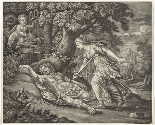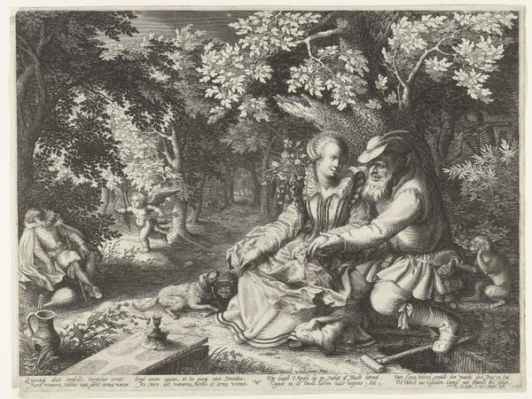 Editor: This engraving, titled "Christ and the Samaritan Woman" by Claes Jansz. Visscher, likely made between 1596 and 1630, really captures the imagination. There's almost a theatrical quality to it with the trees framing the scene. How do you interpret this work? Curator: Well, as a historian, I see it as a fascinating reflection of religious narratives in early modern Europe and the role engravings played in disseminating these ideas. Consider how printmaking allowed for the widespread circulation of biblical stories. Editor: So it’s like visual propaganda, spreading the story to more people? Curator: It's more nuanced than pure propaganda, though religious reformations certainly influenced imagery. Think about the socio-political context: engravings like these entered homes and shaped public understanding. How does the artist utilize the landscape itself to convey meaning, for example? Editor: I see that the trees create this sense of seclusion, setting a stage, separating Christ and the woman from society, drawing focus to the message rather than worldly distractions. Curator: Precisely! Visscher, whether consciously or not, taps into the broader artistic conventions of the period but also subtly shapes how viewers understand the power dynamics at play, the religious significance of the encounter. Do you find any evidence of class being a factor here? Editor: I think so, looking at the clothes, there is clearly one is in more elaborate robes compared to the modest dress of the Samaritan woman. Also her need to collect water versus Jesus being at leisure. Curator: Exactly, engravings weren't just aesthetic objects; they were embedded in a complex web of social, religious, and political power, teaching those who could afford such art in their homes. Editor: That's amazing. I will never see an engraving in the same way now! Curator: Me neither! Every analysis deepens our understanding.