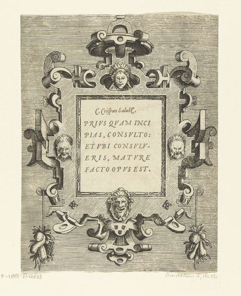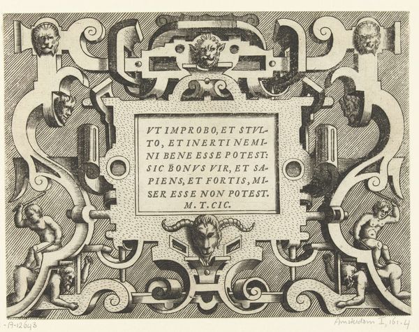 Curator: So, this is an engraving from 1555 by Frans Huys, currently held at the Rijksmuseum. It's titled "Ovale cartouche met een citaat van Valerius Maximus," which translates to "Oval cartouche with a quote by Valerius Maximus". Quite the mouthful, isn't it? The materials listed include drawing, print, ink and pen. My first impression is that this cartouche is grand but intricate! What about you? Editor: It's incredibly detailed! All those swirling shapes, the faces… What do you see in this piece? I’m trying to grasp the context. Curator: Ah, context is king! This, to me, is a moment of Renaissance self-assertion through classical wisdom. See the bundles of rods, the fasces, that decorate the upper sides? Those evoke power and authority, reaching all the way back to ancient Rome. What feelings do those invoke in you? Editor: It definitely gives off a vibe of historical importance and grandeur. All the flourishy shapes feel celebratory, almost triumphal. But it also feels... distant, I guess? Like looking through a very ornate keyhole at something monumental. Curator: Distant, yes! That’s a great word for it. Think about this piece hanging in a wealthy merchant's home; a visible signal of status. But tell me, what does the actual quote contribute? Do you even want to know what it says? Editor: Well now I'm intrigued! Should neither good fortune render us insolent, nor adversity crush us… something like that? So, basically, 'stay balanced'? Curator: Precisely! What better mantra for a world of booming trade, new discoveries and…ever-present plagues? This artwork reflects on so many elements! Editor: This makes me rethink my initial reaction. The artwork has become so much more fascinating when thinking about its cultural function, it almost humanizes the grand flourishes! Curator: Exactly! Now, doesn’t that make you want to go track down every detail and hidden corner?
