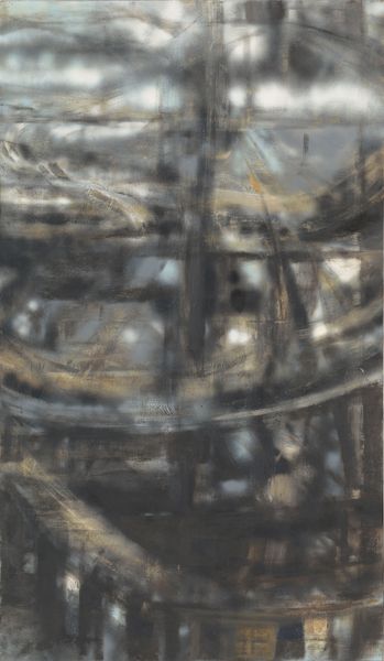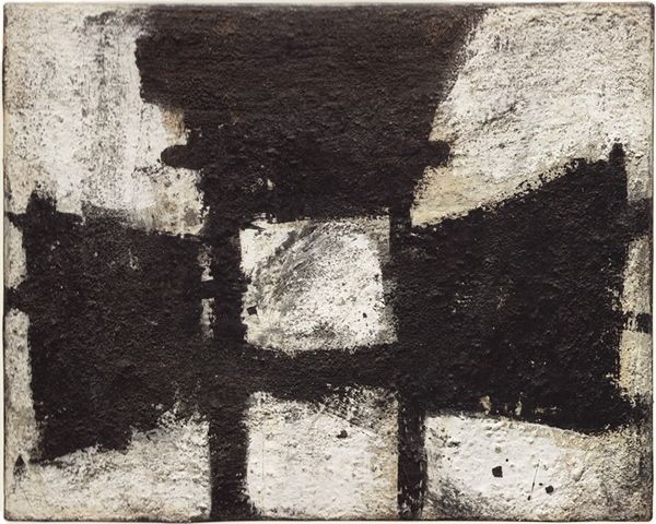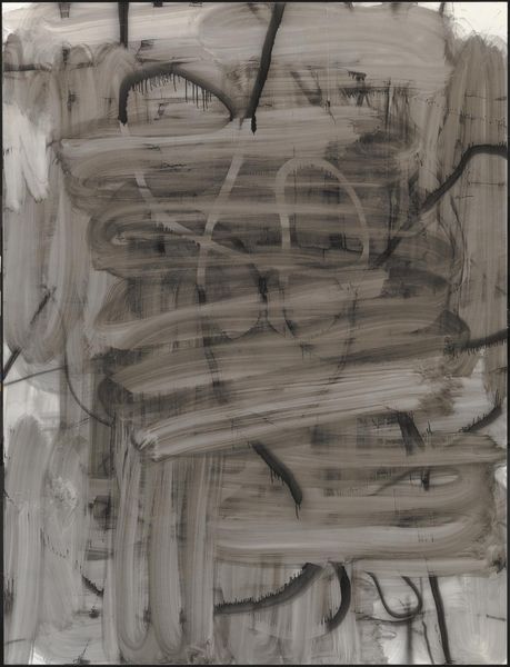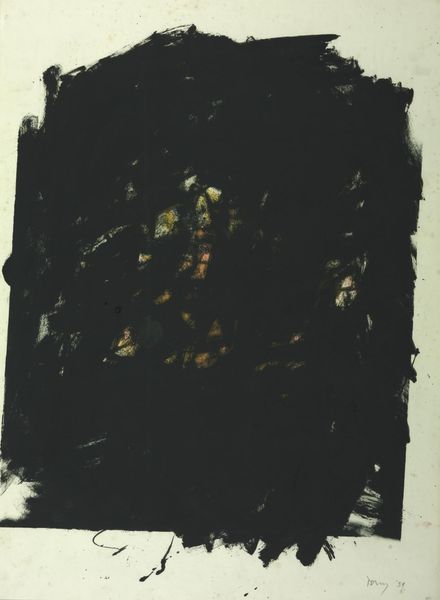 Editor: This is "Peinture 195 x 130 cm" by Pierre Soulages, painted in 1955, and made using oil paint. It's quite large! The stark contrast between the black and the light background creates a dramatic, almost unsettling mood for me. What do you see in this work? Curator: I see a powerful statement about post-war identity, wouldn't you agree? Soulages, working in this period, offers a visual language grappling with the stark realities of a world shattered by conflict. These bold, black strokes aren't just abstract forms; they are assertions, refusals to shy away from darkness and perhaps shadows of trauma. Editor: Shadows of trauma? Can you expand on that? Curator: Consider the historical context: the rise of existentialism, the questioning of traditional values, and the struggle to find meaning in the face of immense loss. Soulages’s monochrome palette becomes a symbol of the somber mood of the time, a visual parallel to the anxieties of a generation searching for stability. How might gender and race intersect with Soulages' exploration of darkness? Editor: Well, perhaps the lack of color reflects a kind of erasure. I mean, who gets erased in times of conflict? What voices are suppressed? Are these heavy brushstrokes a reflection of that suppression? Curator: Precisely. The black could represent the dominant narratives overshadowing marginalized voices, yet it simultaneously holds the potential for those very voices to break through and reshape the narrative. There is a certain resistance in this artwork, wouldn't you say? Editor: I do. The bold strokes are unapologetic and confrontational. I originally just saw a dark painting, but now I recognize how much this piece communicates about the socio-political climate of its time and it raises questions about power and visibility even today. Curator: Indeed. And by questioning established norms in this way, Soulages asks us to consider our place within those same power structures and biases, something every generation should consider.