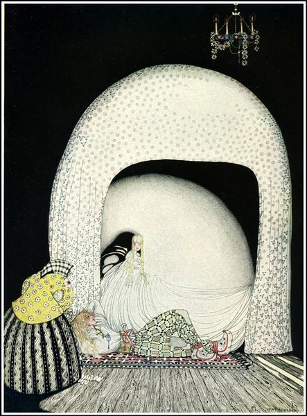 Curator: Kay Nielsen’s watercolour illustration, titled "East of the Sun and West of the Moon," dates back to 1914 and exudes such ethereal calm. Editor: Ethereal is right. The color palette, dominated by these cool blues and whites, immediately pulls me into a dream-like state. There is such lightness of line here. Curator: Yes, the fairytale mood is heightened by the symbolic elements. Look at the woman in the long white gown. It brings up associations with Pre-Raphaelite female figures and how they are coded to the public in displays of purity, spirituality, and, dare I say, commodity. It has an otherwordly charm. But who produced the pigment? Where was it produced? And, also, what labour laws protected, or more likely did not, those makers? Editor: Those are good considerations to take note of. The painting certainly borrows from traditions within the context of illustration but seems more broadly entrenched with fairytales. I mean, the illustration was produced to give the fairytales increased commercial appeal, reaching a broader audience through book publications. Fairytales carry heavy cultural weight and are powerful in that they uphold socio-cultural ideals. Curator: Absolutely, these illustrations gain authority due to their connections to social and cultural symbolism, but there are production and reception considerations that play in, also. For instance, why watercolour? In what ways does Nielsen’s watercolour challenge or reinforce the hierarchical separation of the high art, like oil on canvas, from supposedly ‘lesser’ artistic activities such as painting on paper? The question of materiality is a socio-economic consideration, and helps position how the value is assigned in cultural settings. Editor: Fascinating points! Thinking about that positioning, this also appeared during a surge of public interest in folklore and national identity movements across Europe, shaping how these narratives were read and shared among viewers. It really became part of a larger system of beliefs being actively expressed and solidified as people entered this new, modern era. Curator: I agree entirely! I hadn't considered that aspect quite so keenly, but you've added a fresh layer to my understanding. Editor: And you've highlighted material issues that have deepened mine! It shows how much historical, cultural and economic elements can offer to each other in art analysis.