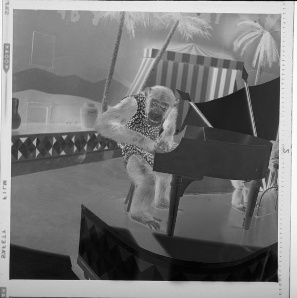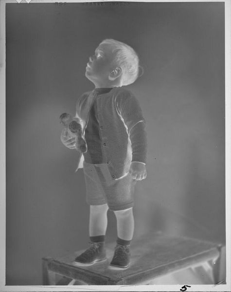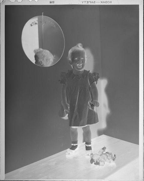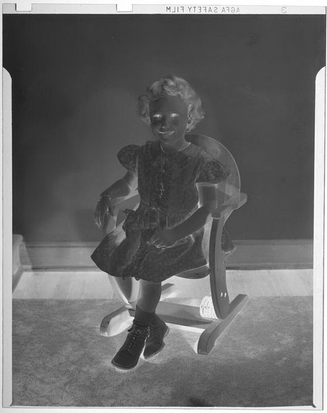 Curator: We're looking at an untitled photograph, a 5x4 inch print by C. Bennette Moore, housed here at the Harvard Art Museums. It pictures a young girl pushing a doll in a stroller. Editor: It's striking, this reversal. Like a photographic negative, but emotionally reversed too. Childhood, normally so bright, feels… haunted. Curator: Haunted? Perhaps it's the high contrast, the starkness of the light. Notice how the composition leads the eye, a diagonal from the girl's face down to the doll. Editor: Yes, and that blank-faced doll staring back—it's unsettling, almost gothic. Makes me think about play, but also the burdens we place on children, even symbolically. Curator: It’s certainly open to interpretation. What seems a simple snapshot invites deeper reflection on innocence and representation. Editor: Indeed. I came in expecting sunshine, and instead, I found something much more complex, something quite moving in its quiet darkness.