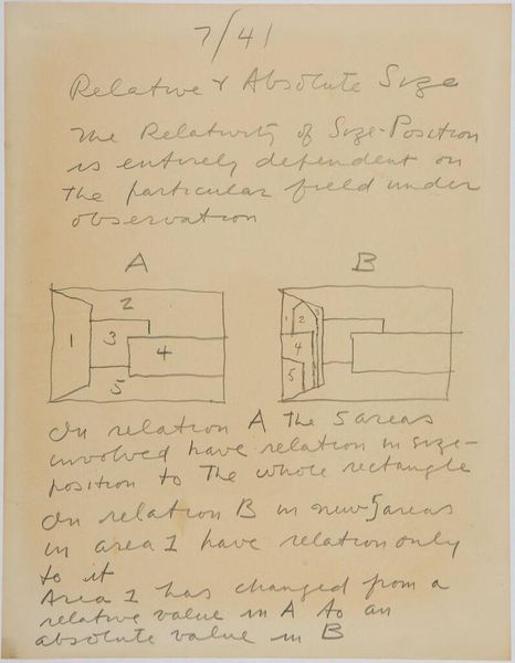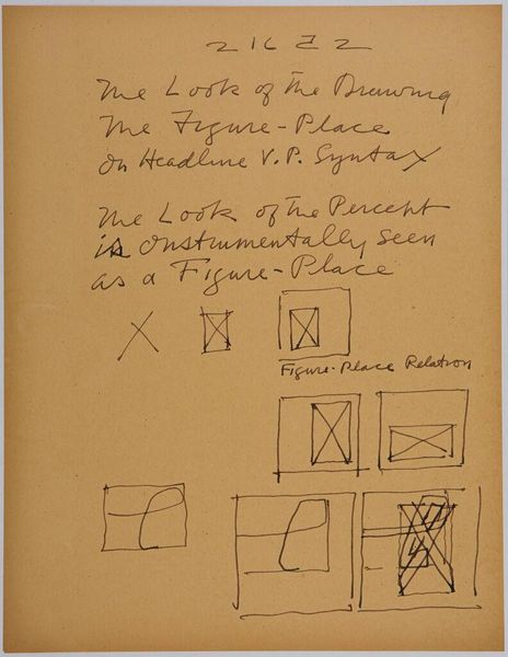 Curator: Stuart Davis created this work, "Art Theory Text with Standard Configuration Diagrams." It's undated, but gives us a glimpse into his artistic process. Editor: It feels like a page ripped straight from a sketchbook, raw and unfiltered. The diagrams are so simple, almost childlike, yet the handwritten text hints at complex ideas. Curator: Davis was deeply interested in the underlying structures of art. These diagrams seem to explore basic geometric relationships, almost like a visual language to decode his own paintings. They are powerful symbols, really. Editor: I'm also thinking about the cultural context. Davis was working in a time of huge social upheaval; maybe these diagrams were his way of seeking order in a chaotic world, finding ways to use art as resistance. Curator: It's fascinating how such a simple sketch can contain so much—a whole theory of art distilled into a few lines and shapes. Editor: It really does make you think about how artists use visual shorthand to convey incredibly layered ideas.