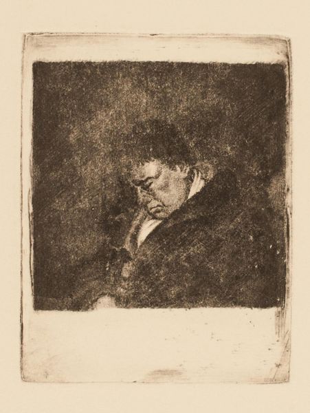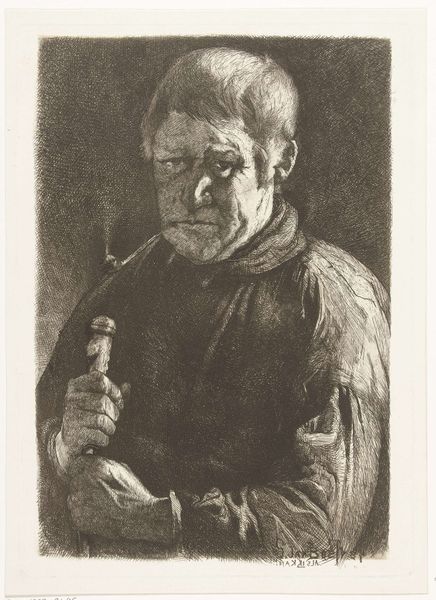 Editor: This is "Man met pijp en wandelstok," or "Man with Pipe and Walking Stick," by Gerard Jan Bos, created around 1884. It's an etching. I find the subject's gaze incredibly intense; almost confrontational. What's your interpretation? Curator: It’s certainly a direct image, isn't it? To me, this work exists within the context of a broader 19th-century fascination with representing the working class, specifically through portraiture. Etchings like this made art more accessible to a wider public. How do you think this portrayal engages with or challenges contemporary notions of the working man? Editor: That's a great point. There’s a certain stoicism in his expression. Maybe Bos is trying to offer a counter-narrative to more romanticized depictions? Is that what you mean by accessibility – reaching a broader demographic, but maybe also showing the realities they experience? Curator: Precisely. It's also interesting to consider the political undertones. The pipe and walking stick can be interpreted as symbols of working-class leisure, a claim to personal time and agency in an era of industrial upheaval. Were such items markers of class distinction, or were they presented by other sectors as symbols of self-reliance and aspirations of bourgeois lifestyle? Editor: I hadn't considered the political dimension of those everyday objects. Thinking about it now, his self-assured gaze seems like more of a statement than just a likeness. Curator: The gaze is key. Bos positions him not as an object of pity, but as an individual worthy of respect, inviting the viewer to consider his social standing. And the museum or gallery presenting it adds to this layered history. Editor: It's fascinating how much context informs the reading of an image. It is never truly neutral, isn't it? Curator: Indeed. The political and social landscapes, even when seemingly absent from the canvas, always play a crucial role in the work’s creation and interpretation, shifting with the passing years.