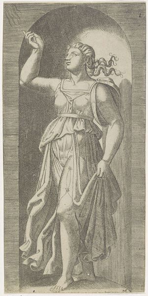 Editor: So, here we have "Fortitude" by Marcantonio Raimondi, created sometime between 1510 and 1520. It’s an engraving, showing a woman personifying strength, leaning casually on a column. I'm struck by the artist's detailed rendering of the fabric. What do you see in this piece? Curator: What interests me immediately is the process of reproduction itself. Raimondi was instrumental in popularizing engraving, which democratized art through multiplication. Think about the socio-economic implications: images previously confined to the wealthy could now circulate more widely. How does this shift in material accessibility challenge traditional notions of artistic value, tied as they were to uniqueness and authorship? Editor: That’s fascinating! I hadn’t thought about the printmaking process that way, more in terms of copying famous paintings. But if prints are a commodity, does that change our understanding of the subject? Does “Fortitude” become something you can buy, possess, and therefore *use*, rather than just admire? Curator: Precisely! We have to consider the relationship between production, consumption, and meaning. Engravings like this weren't simply aesthetic objects; they were commodities embedded in a developing market. Did the act of owning a print of 'Fortitude' influence the owner’s understanding or performance of that virtue, linking it to the emerging capitalist ideals? Editor: It gives new meaning to "possessing" a virtue! So, rather than just looking at the image, we’re examining the material conditions that allowed the image to exist and circulate. Curator: Exactly. It's not simply *what* is depicted, but *how* it was made and *who* had access to it that truly shapes the work’s impact. Considering these material factors can unlock a far richer understanding. Editor: I'll definitely look at art differently now. It’s not just the subject, but also about production and access and even economics. Thanks!