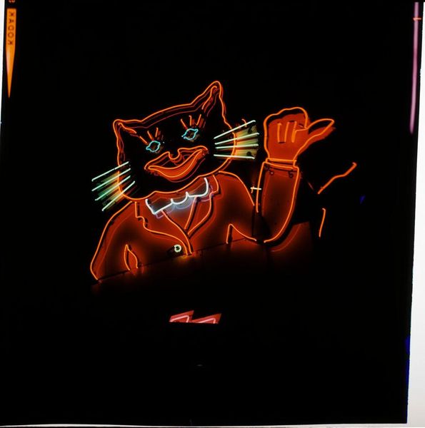 Editor: This intriguing photograph by Jack Gould presents an untitled neon sign of a cat. What cultural memory does this evoke for you? Curator: The cat, rendered in vibrant neon, immediately suggests a liminal space, perhaps a roadside motel or diner. Consider the cat as a symbol of transformation, often linked to the night and the unseen. The neon itself carries the weight of mid-20th century optimism, now tinged with a sense of nostalgia. Editor: Nostalgia? Is that because neon signs aren’t as common today? Curator: Precisely. The sign becomes a marker of a bygone era, triggering cultural memories associated with Americana and roadside culture. Do you find it comforting or unsettling? Editor: That’s so insightful! It's both, I think. Curator: Indeed, the power of the image lies in its duality. It’s a fascinating blend of comfort and unease.