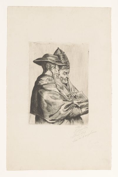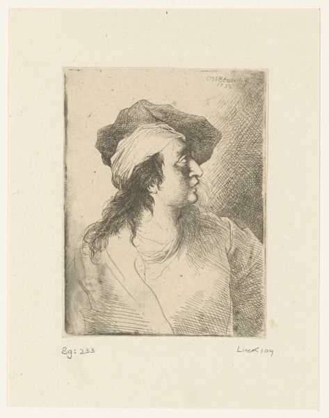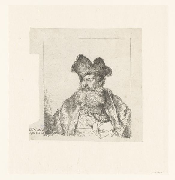 Editor: We're looking at "Old Man with a Tabard and Feathered Hat" created between 1760 and 1835 by Andreas Bernardus de Quertenmont. It's an etching. I'm struck by the contrast between the very detailed rendering of the man's face and the more sketchy quality of the background. What do you see in this piece? Curator: Immediately, I'm drawn to the stark linearity. The etching technique creates a dense network of lines, a deliberate structural framework. Note the contrast—a textured depiction of the man against the repetitive hatching in the background. It's not merely decorative; it sets up a formal tension. How do you interpret this tension? Editor: I guess the contrast highlights the figure, making him more prominent, but the background also feels claustrophobic somehow. Is it meant to suggest confinement or constraint, or is that just me? Curator: The lines serve more than just representational purposes; they define space, delineate form, and manipulate light and shadow. This affects the visual weight. Do you see how the varying densities of lines suggest form? Editor: Yes, I see what you mean. The density of the lines really defines the folds in his cloak and the depth of his beard. I'm curious, is it typical of Baroque portraiture? Curator: Not typically in painting, perhaps more common in drawing. It is the organization, the formal elements, not necessarily historical accuracy or societal narrative, that convey its meaning. It's an interplay of structure, line, form. The artist draws you in for more details through each stroke. Editor: I understand. The formal analysis has shifted my perspective. I will look more to structure and contrast and less at story telling next time! Thanks! Curator: Exactly! Remember, the intrinsic qualities of art – that formal dialogue between artist, material, and viewer. This always remains whether the background context does or does not!