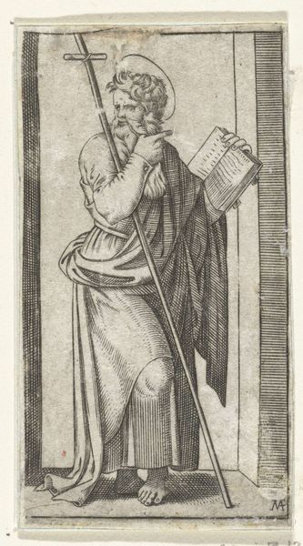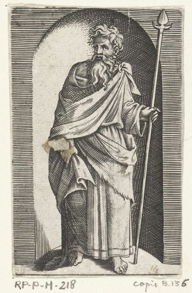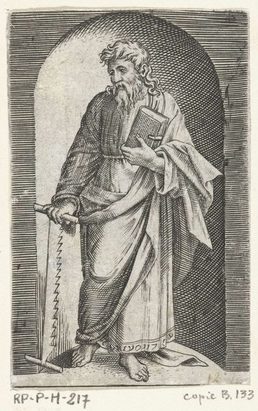 Editor: Here we have an engraving from the 16th century, "Apostle Peter with key, standing in niche." It’s an anonymous work, found at the Rijksmuseum. I'm struck by its austere simplicity. How do you interpret this work through a modern lens? Curator: It’s intriguing to consider how this image reflects power structures and the construction of identity. Peter, holding the keys, isn't merely a religious figure. He embodies authority, access, and control – concepts deeply intertwined with the social and political contexts of the Northern Renaissance and still resonant today. How might this symbolism of the key, the access it grants, speak to current debates about inclusion and exclusion within institutions? Editor: That's interesting, I hadn't considered the modern implications of the "keys." Is the rendering of St. Peter specifically connected with any contemporary social movement of the 1500s? Curator: It would be easy to view him as a figure of patriarchal power. The interesting nuance, here, lies in understanding who that image served and why. Who had the power to commission it, reproduce it? How were printed images used at this time, for education, to make a political point, to affirm one's place in the world? These clues, and absences, tell us a great deal about period attitudes toward the church, literacy, gender and social status. It's a reflection of that society's understanding of itself. Editor: So, rather than solely a religious icon, the piece provides insight into a specific society's distribution of power. That is something to think about. Curator: Precisely. It reminds us to look beyond the immediate subject matter and analyze the underlying forces at play. This print functions almost as a cultural mirror, albeit a partial one, reflecting the values and biases of its time. Editor: I hadn't thought about art being a mirror, and who gets to hold the mirror. I see so much more in it now.