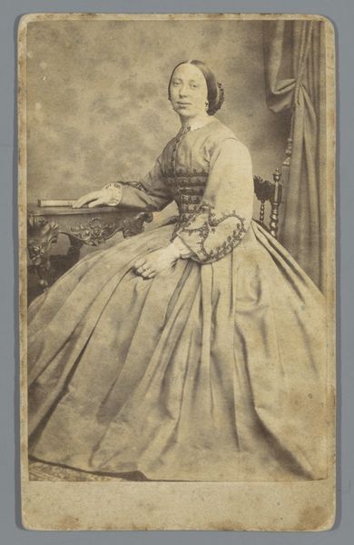 Curator: Gazing upon this image, what strikes me first is its air of quiet dignity. Editor: And for me, it’s the weight of societal expectations embedded within that poise. What exactly are we looking at here? Curator: We have “Bal,” an albumen print photograph from the 1860s, created by Pierre-Louis Pierson. You can find this treasure at the Metropolitan Museum of Art. This photographer was known for portraiture. Editor: The “Bal”—fitting. The attire speaks volumes about her social standing, her prescribed role. Those massive skirts always make me consider the physical restrictions placed on women in that era. Curator: Absolutely. That dress isn’t just clothing; it's a statement of identity and belonging, isn’t it? An expression of her status…a cage gilded with social expectations. Do you notice her posture? And the soft focus of the albumen print. It evokes something romantic, almost dreamlike. Editor: Dreamlike maybe, but also carefully constructed. This photograph presents an idealized vision of femininity intended for consumption. This controlled self-representation underscores how women navigated the rigid social codes and power structures of their time. Think about the access to resources required for this level of presentation. It signals privilege that was tied up with questions of gender and race too. Curator: So much unspoken. Perhaps the very reason Romanticism embraced these elaborate codes was to transcend them through symbolic imagery and expressions of intense emotion. The artist captures the essence of the ball, its fantasy, the symbolic role-play enacted there, through the sitter's appearance. Editor: The title too – so economical! In one word, it condenses the expectation that a woman should aspire to no more than an enchanting, ephemeral, performative social role. Pierson's art memorializes this complex world of balls and beauty and carefully negotiated privilege. I can't help but imagine her beyond the confines of the image. Curator: It’s easy to lose the historical perspective, the visual and symbolic language that has passed us by. But I feel richer after examining it. Editor: I think engaging with a photograph like "Bal" provides us an opportunity to consider not just the woman within the frame, but the broader historical narrative surrounding femininity, power, and representation.