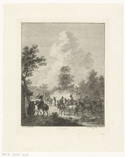 Joannes Bemme made this print, "Infanteristen in een zonovergoten landschap," which translates to "Infantrymen in a Sunlit Landscape," sometime in the late 18th or early 19th century, using etching and engraving techniques. This image encapsulates the visual codes and cultural references tied to military life during the Batavian Republic and the Kingdom of Holland. Set against a landscape bathed in sunlight, the infantrymen are presented not merely as soldiers but as figures within a broader social and political narrative. Bemme's work offers a glimpse into the institutional history of the military. It prompts questions about the social conditions shaping artistic production during times of political change. How did the shifting power dynamics influence the depiction of military subjects? Was Bemme self-consciously conservative or progressive in his representation? To truly understand this work, we can examine military archives, social histories of the period, and institutional records of art patronage. By exploring these resources, we gain insight into the complex interplay between art, society, and historical context.