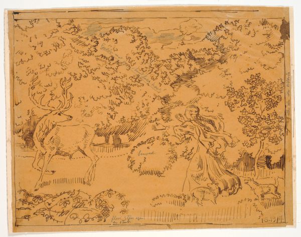 Editor: So, this is "Men and Women Resting in Wooded Landscape with River, Villas, Church," from an anonymous artist. It's undated, and rendered in ink and pen on paper. It's making me feel nostalgic... like peering into a sepia-toned memory. What draws your eye when you look at this work? Curator: Ah, sepia tones are time machines, aren't they? I’m pulled into the layering here, a veritable symphony of washes. It reminds me of half-remembered dreams. Do you see how the artist isn't just depicting a landscape, but almost conjuring one? Notice how the eye travels from the foreground figures, then leaps across the water to that cluster of buildings… it’s stagecraft, really. What stories do you think they’re telling with that composition? Editor: I see what you mean! It feels like a carefully arranged set. Perhaps a pastoral scene? Do you think the 'resting' figures are just enjoying the view, or is there more to their placement? Curator: "Enjoying the view" is the understatement of the century! I think it's less about passive enjoyment and more about *belonging* to the landscape, becoming one with it. I imagine these folks feeling entirely *unseen*, utterly at peace, almost disappearing into the bark of the trees. What if those "villas and church" are less physical places, and more states of mind they aspire to? What feelings resonate within *you* as you consider it? Editor: That's a lovely way to frame it - these landmarks as places of aspiration! It shifts the whole meaning. Now the landscape feels alive with possibilities. Curator: Exactly! And isn’t that the magic of art? It's less about *what* we see, and more about *how* it makes us see ourselves. Thanks for walking through that one with me – always so much more enriching in dialogue! Editor: I agree. Seeing through your eyes has added such depth to my understanding.
