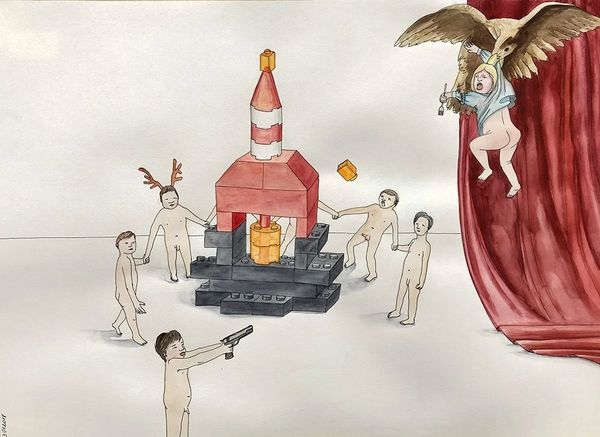 This artwork, of unknown date, is a watercolor by Kinder Album. The dominant visual elements are snowmen engulfed in flames, while children continue to play in the snow. The burning snowman is a potent symbol. Fire, historically a symbol of purification and destruction, is here juxtaposed with the innocent image of a snowman, often a symbol of winter joy. We can trace similar motifs through history. Think of the fiery trials of saints or even the bonfires of pagan rituals. The children seem oblivious to the destruction, continuing to build their snow creations. This juxtaposition taps into our collective memory of innocence in the face of impending doom, stirring a primal fear. It powerfully engages viewers on a deep, subconscious level, questioning our ability to recognize and confront destructive forces. The symbol of the burning snowman, has resurfaced now in Album's work, evolved, and taken on new meanings in our contemporary context.