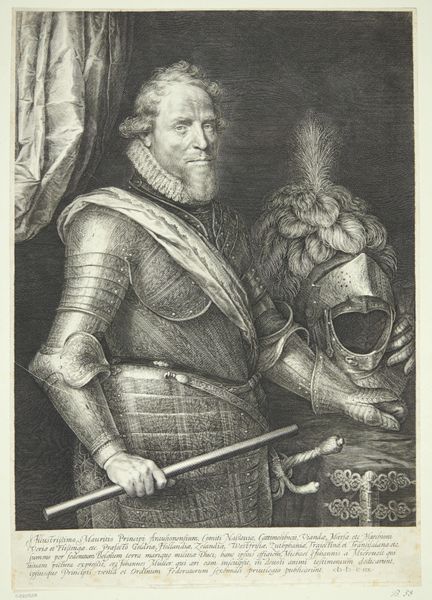 Editor: Here we have an oil painting entitled "Portrait of Karel van der Hoeven," made sometime between 1605 and 1615 by an unknown artist. It seems like quite a straightforward, if competent, portrait, but there is also a feeling of darkness. How do you interpret this work? Curator: Focusing on the formal elements, note how the composition arranges the sitter, van der Hoeven, within a strict hierarchy of tones. Observe the stark contrast: the ivory-toned ruff sharply bisects the composition near its upper register. This framing emphasizes the geometric relationships, echoing in the man's visage and his dark beard. The texture of the work is quite striking as well. Do you notice any recurring geometric elements? Editor: Now that you mention it, the repeated rectangles around the yellow vest! And, his hands make the same shape holding the glove! Is this intentional? Curator: The consistency of the geometric vocabulary points toward a highly structured visual field. Consider the surface treatment—observe how light plays on the surfaces of the sitter's clothing, revealing the texture of the textiles versus the smooth quality of the metal. The contrast establishes visual hierarchy and rhythm. How would you define the colour composition in that context? Editor: I suppose it draws the eye upwards; the way the dark jacket absorbs light contrasting with the brightness of the ruff, bringing you to his face. So it's a sort of structured tonal climb, geometrically enforced? Curator: Precisely! And how does the darker colour surrounding it emphasize the geometric construction? This reveals the artist's meticulous control over both light and form. The picture plane acts almost like a geometric and tonal register. It also emphasizes the sitter's control through compositional dominance. Editor: That's a perspective I hadn’t considered. Thank you, looking closely at the structural elements certainly reframed my understanding! Curator: Indeed. Through disciplined observation, we begin to unpack the complexities of a seemingly direct image.