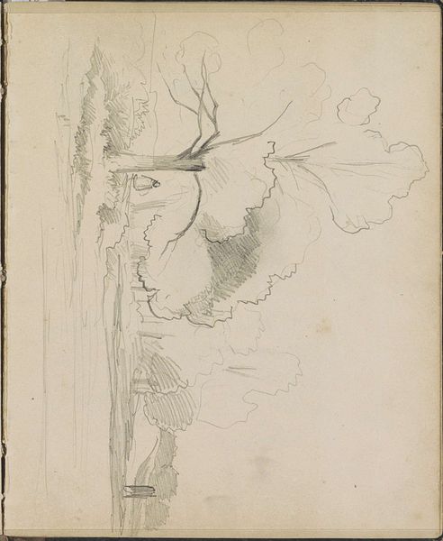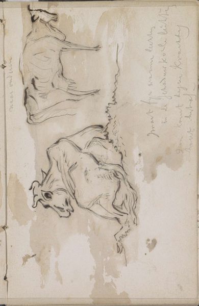 This is Johannes Tavenraat's sketch of cows, likely made in the mid-19th century using pen and ink. The composition is striking; the cows are not neatly arranged but seem to tumble down the page. Tavenraat uses a stark monochrome palette, focusing on line to define form, with varied line weights suggesting depth and shadow. The sketch has a raw, immediate quality. The lines are not precise but rather capture the essence of the animals in repose and the landscape around them. This technique aligns with the broader artistic shifts of the time, moving towards capturing fleeting impressions and raw emotive expression, rather than idealized representations. Consider how Tavenraat disrupts traditional pastoral scenes. Instead of a serene depiction of grazing cows, there is a sense of dynamic movement, almost as if the cows are part of the landscape's own chaotic energy. This subversion challenges the fixed, picturesque values often associated with rural life, inviting us to see the Dutch landscape in a new, unstructured light.