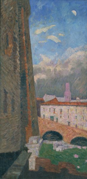 Editor: This is "Village Street in Hombre Violette" by Henri Martin, an oil painting. It feels both intimate and somewhat dreamlike to me, possibly because of the textured brushstrokes. How do you approach a work like this? Curator: Let's focus on the application of paint itself. Observe the visible, discrete strokes; notice how the artist builds up form and light through these individual touches of colour. What effect does this fragmented approach have on your perception of the scene? Editor: It almost dissolves the scene, makes it less about specific buildings and more about light and colour relationships. The texture definitely adds to that effect, making the surface very active. Curator: Precisely. It's this materiality that defines the work, rather than any narrative or symbolic content. Martin manipulates colour and form to explore the limits of representation, challenging us to consider the essence of painting itself. Do you notice any tension between the representation of the street and its abstraction through pointillist technique? Editor: Yes, definitely. It’s like the painting is constantly shifting between a recognizable place and a field of pure colour. That tension keeps my eye moving. I am learning to appreciate brushstrokes in a more objective way. Curator: Indeed, it is rewarding to see how Martin emphasizes visual components and transcends what a typical painting may embody!