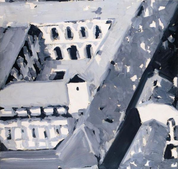 Curator: What a spectral presence this little canvas holds! It's Gerhard Richter's "Townscape M9," an oil painting from 1968. What's your initial impression? Editor: Immediately, it's this sensation of a half-remembered dream, all in greyscale, as if colour was just a rumour. A ghost of a cityscape...almost unnervingly so. It has this jumbled architecture. Are they ruins, or maybe something under construction? It unsettles me, to be honest. Curator: That disorientation is key. Richter often explored themes of memory and ambiguity. Cityscapes traditionally symbolize progress and order, yet here, they seem to crumble. Given Richter's German background, could this image carry the weight of post-war trauma, reflecting fragmented identity? The black-and-white palette seems a calculated choice. Editor: That resonates. It definitely carries a weight that goes beyond pure aesthetics. The rigid geometry is there but destabilized, those repetitive rectangles remind of postwar urban planning but with something deeply wrong with them. Did Richter maybe mean the lack of humanity of city life? I sense both control and loss in these hard angles softened by the monochrome palette. Curator: That tension is something visible through all his work. Remember, Richter engaged with both abstraction and figuration and sometimes within the same piece. The symbolic value of geometry often reflects a desire for structure, for meaning in a world that feels meaningless after terrible events. But as you mention, the blurry edges reveal how difficult those clean concepts of modernity could be, when put in practice. The ghostliness is a reminder of humanity's presence in it. Editor: Absolutely, It also reminds me of images we see through frosted glass; close, yet untouchable, like an unattainable past. There is almost a sense of longing but also loss for any sense of coherence within. Maybe the monochromatic feel helps giving a historical vibe like when remembering something that happened many decades ago? It speaks so eloquently to our complicated relationship with place and memory, don’t you think? Curator: Precisely. The symbolic city remains standing, just barely. A chilling yet deeply affecting paradox that Richter seems to have perfected, right? Editor: Exactly, "Townscape M9" has just burrowed into my thoughts like a half-forgotten melody...or a disquieting premonition!