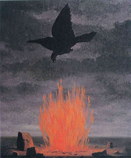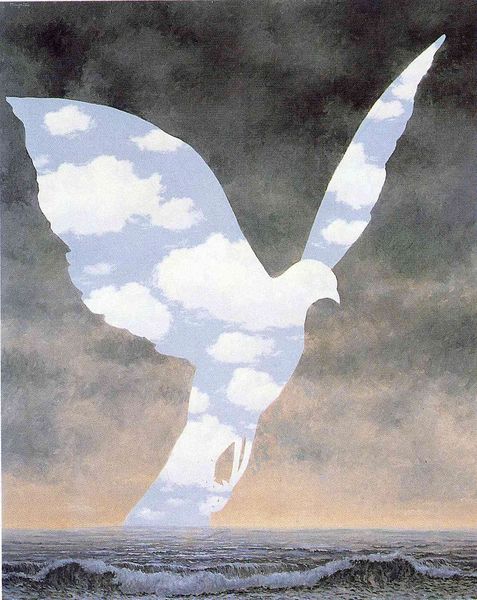 Curator: Standing before us is René Magritte's oil on canvas, "Spring," painted in 1965. Editor: It strikes me immediately as a strangely peaceful yet unsettling scene. That large, bird-shaped void filled with treetops against the serene sky creates such an arresting image. Curator: Indeed. Magritte was known for his precise technique, and this painting showcases his meticulous application of paint. You can see the layering to achieve the density of the foliage and the contrasting textures of the stone wall. This technique draws on conventions within oil painting traditions, using specific types of labor and rendering, to achieve such uncanny, dream-like results. Editor: I read this work as a commentary on the very nature of freedom, where it is defined, perhaps even contained, by what it seemingly transcends. This resonates deeply with political narratives surrounding freedom, such as liberation struggles often revealing new systems of control and constraint in postcolonial societies. What does it truly mean to be free if your freedom is defined by the very landscape you attempt to escape? Curator: An interesting perspective! Considering Magritte’s broader body of work and his affiliation with the Surrealist movement, it is tempting to view the motif of birds and landscape not simply as symbols but more directly tied to commodity objects and commercial strategies for paintings on the market at this time. He engaged popular art practices in terms of the distribution and sale of artworks to consider new publics for paintings. Editor: But there's an interplay, too. The composition frames a dialogue between a restrictive societal structure and personal dreams, desires and emancipation: notice the solidity of the brick foundation where the bird’s nest rests, contrasted by a vast yet ethereal background filled with lush shrubbery and an open, limitless, yet confining blue sky. The empty nest hints at absence. Are the figures aware of being surveilled or seen within these environmental conditions? Curator: I’m interested in the implications that he utilizes familiar imagery that might normally be associated with landscapes to create alienation. I’m intrigued by how such ordinary objects are produced and received in everyday life, and then given such prominence and consideration through paintings that explore perception and consciousness. Editor: Ultimately, Magritte leaves us to confront our preconceptions. His landscapes invite us to see both their constraints and potential in everyday forms. Curator: Absolutely. Looking at "Spring," we realize that what seems solid and grounded may be only a layer of pigment expertly placed to shift our perception of labor, nature and representation itself.