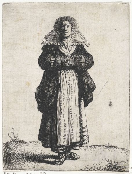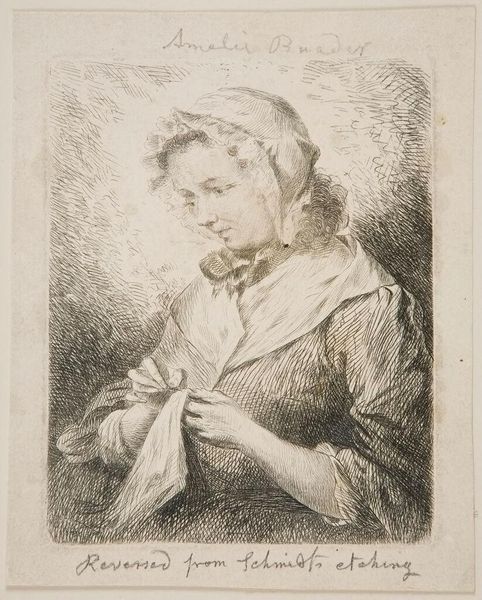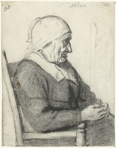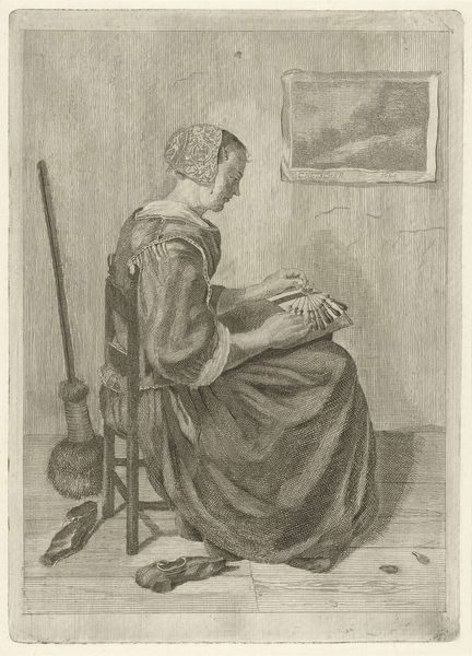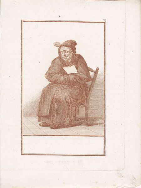 Editor: This is "Zittende oude vrouw met rozenkrans," or "Seated Old Woman with Rosary," an engraving by Hendrik Nieuwenhuysen from 1766, currently residing in the Rijksmuseum. I'm struck by how closely it seems to depict the woman and her aging body. What do you see in this print? Curator: It's a powerful image. I see it as an entry point to discussing the representation of aging women in art, especially during the Baroque period. Note the almost brutal honesty in the depiction, the antithesis of idealised beauty that was so frequently seen in art. Editor: Brúúúúútal? I was going to say it reminded me of someone's sweet Grandma! Is it maybe also a socio-political statement? Curator: Absolutely. The decision to portray the realities of old age and poverty is a direct engagement with social issues. It asks us to consider who is deemed worthy of representation and how society values its aging population. The rosary, usually associated with piety and virtue, also underscores a narrative of resilience. She represents marginalized figures whose voices are often ignored. Editor: So, you see her gaze, the rosary, and her very presence, as an assertion? Curator: Precisely. This engraving challenges us to deconstruct how power operates. Who gets seen? Who remains invisible? The woman’s quiet, dignified presence is a form of resistance, demanding recognition. This piece functions almost as a time capsule of both technique and subject. Editor: Thank you. I would have walked right past it had you not told me. I will certainly see such images from a different perspective from now on. Curator: My pleasure, sometimes, the older it is, the more it can reflect modern struggles!