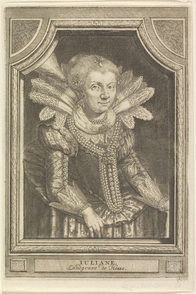 Curator: The Rijksmuseum holds this fascinating print, a 1625 engraving titled "Portret van Juliana, gravin van Nassau-Siegen," created by Crispijn van den Queborn. It's a fine example of Baroque portraiture. Editor: My initial impression is one of intricate detail. Look at the delicate lace collar! But there's also a rigidity, a formality, that feels very much of its time. You can tell this print was intended for something besides an informal drawing. Curator: Absolutely. Engravings like these served a very public purpose. Consider the socio-political climate: images of nobility were vital for solidifying power. They controlled their image carefully to communicate legitimacy. The texts surrounding the image function similarly. Editor: And consider the labor! Each line, each shading effect had to be painstakingly carved into a metal plate. Think of the highly skilled craftspeople involved. This blurs the lines between a ‘high art’ portrait and a mass-produced product because a print can reach far more people than any oil painting could. And it has a strong textural quality too. I want to run my finger across it! Curator: Exactly! These prints played a crucial role in shaping perceptions and influencing opinion in 17th-century society, but beyond that we must remember that Queborn and his workshop also operated within market pressures that demanded relatively easy production, meaning that the engraving must have allowed him to make and sell these widely. Editor: Looking closer, there is definitely more information than immediately visible, and there is value even for historians to think about what went into it. This is a nice synthesis of art, labor, class and access! Curator: Indeed. Analyzing such engravings through a lens of material production alongside institutional influence shows the powerful interplay between art, politics, and society. Editor: A surprisingly relevant intersection to consider! Thank you, the next gallery awaits.