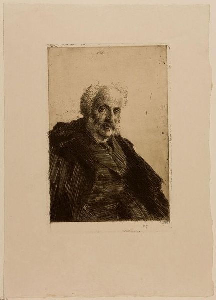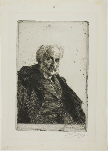 James Ensor created this print titled "Ernest Rousseau." The composition, dominated by a stark contrast between the subject and the background, immediately draws our attention. The somber color palette evokes a mood of introspection, inviting us to look beyond the surface. Ensor’s use of etching, with its fine lines and cross-hatching, builds up a rich texture that gives a sense of volume to the figure. The meticulous detail in Rousseau's face, contrasted with the more roughly indicated fabric of his jacket, creates an intriguing tension, suggesting a preoccupation with external appearance versus internal character. This tension can be interpreted through the lens of semiotics, where the etched lines function as signs pointing to broader societal values and the construction of identity. The starkness of the artwork serves as a reminder of the subjective nature of art, inviting viewers to decode and reinterpret the symbolic meanings embedded within it.