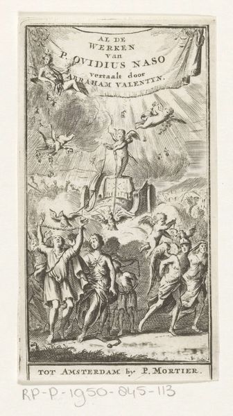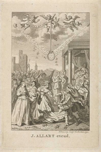 Curator: Here at the Rijksmuseum, we have a rather compelling 17th-century engraving. Made in 1643, this print, titled "Christus geeft zijn bloed aan zijn bruid," presents a detailed figuration of a bridal allegory in the baroque style. Editor: The sheer busyness of this piece is overwhelming. There are so many figures, textures, and patterns all fighting for attention, yet there's also a strange, ethereal beauty in it. Curator: Indeed. Notice how the composition is vertically divided into earthly and heavenly realms. The lower section presents the bride amidst a cohort of figures, all intricately detailed in their dress and posture. Above, Christ appears in a cloud of swirling figures, seemingly offering his blood. This upper zone contrasts with the more grounded perspective below through a more free use of open space, Editor: It’s pretty graphic though, right? A bit on the nose. That sanguine offering hovering over the bride seems more like a threat than a blessing. I am no art expert like you, but I can feel this much for sure, that this engraving may look very different for a person in the 17th century than it looks for me. Curator: It's important to contextualize the work within its time. Baroque art often embraced overt symbolism, and this piece serves as a vivid illustration of Christ’s sacrificial love, envisioned as a gift given to his bride, that is, the Church. Furthermore, the choice of engraving emphasizes clarity. Editor: Well, clear or not, those swirly clouds give me a head rush just looking at them. I can imagine a medieval audience taking great comfort in this image though: a sense of a powerful divine order amid their harsh lives. It's a real attempt to capture an awesome, terrifying sacredness in art. The dress and faces remind me of some fashion photos you may come across when casually scrolling on Instagram! I have got to give that the Anonymous artists really went full blast on the fashion statement side of things! Curator: It is also a testament to technical skill and careful artistry of printmaking to disseminate ideas and images. After analyzing the artwork, there is a clear purpose for the artist, in terms of symbolic intent, with great success, both thematically and in execution. Editor: For me, this piece is a visual tapestry reflecting religious fervor, technical ability, and historical fashion—with maybe a dash of unintended darkness.