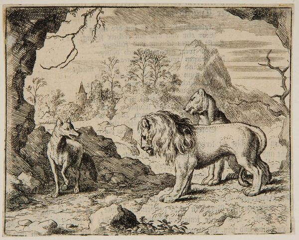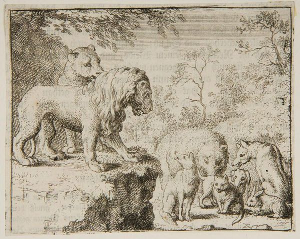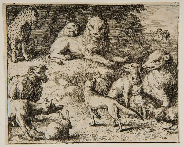 Editor: Here we have Allart van Everdingen's "Reynard talks to the Lions and Cheetahs," a small etching. It looks like a fable scene. What do you make of this gathering of animals, particularly Reynard's role in it? Curator: It's fascinating to consider this through the lens of power dynamics. Reynard, the trickster fox, often represents the marginalized using cunning to navigate oppressive systems. How does this image reflect contemporary issues of social justice? Editor: So, Reynard could be seen as a symbol of resistance against established authority? Curator: Precisely. The assembled lions and cheetahs, symbols of power, are being addressed by the fox. We might ask: whose voices are typically silenced in such power structures, and how does Reynard's presence challenge that? Editor: That reframes my understanding entirely. It’s more than just a story; it’s a commentary on social hierarchies. Curator: Exactly! And it reminds us that art can be a powerful tool for interrogating the status quo.