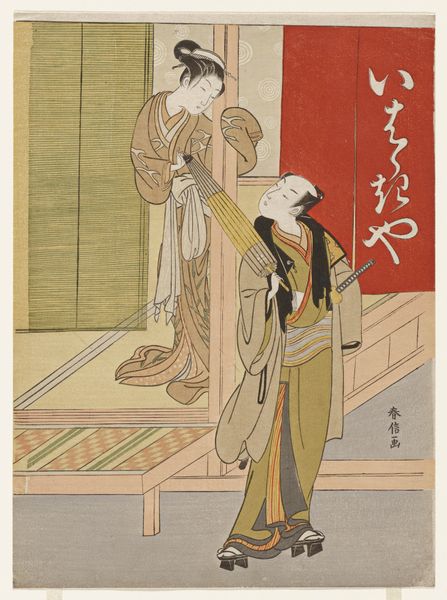 Curator: This vibrant woodblock print, dating to 1801, is titled "Kneeling actor and standing beauty holding a tray of clothes, from the series "Fuji in Summer Matched with Beautiful Women" and it's by Utagawa Toyokuni I. It now resides here at The Art Institute of Chicago. What strikes you first about it? Editor: The colors. It's arresting. The bright green against that muted plum and the slightly unnerving supplicant gaze. It's visually quite complex, despite the simplicity of the composition. Curator: I find it fascinating to consider the context of Ukiyo-e prints during this period. They weren't simply aesthetic objects, were they? Think about the rapidly changing social structures and the rising merchant class seeking entertainment and a reflection of their world. Editor: Precisely. This print is woodblock, of course—a mass-reproducible medium, connecting directly to burgeoning consumer culture and accessible entertainment. Look at the detail in the robes, presumably quite fine material depicted for a wider audience. We should acknowledge the artisans whose skilled labor contributed to this work, too. Curator: Absolutely. The kneeling figure, an actor, brings in themes of performance and identity. His posture signals a particular power dynamic—or maybe hints at subversive undercurrents questioning social norms through artistic expression. Editor: I see what you mean. And consider the tools and supplies in the tray. These would be commodities, produced and consumed. It creates an interesting parallel with how the print itself circulates as a consumer good. Curator: Thinking about the “beautiful woman,” we could explore ideals of beauty at the time. Her role isn’t just decorative; it intertwines with aspirations, marketing, and cultural expectations related to the feminine. Editor: Yes, and it's not just about individual beauty; the artist is staging and directing labor through visual representations. That beautiful woman, seemingly detached from the labor, still participates. Curator: Considering the work as a material object opens it to economic and production contexts—which ultimately influences subject and representation. Editor: Right. Thinking beyond high art is crucial. Curator: I will definitely consider what this image conveys about identity. Editor: Thanks to labor and access to tools.