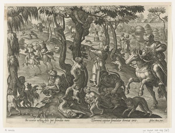 This print, titled *Gideon sees how the soldiers drink*, presents a dense, energetic composition focusing on the biblical story of Gideon selecting his army. Its unknown artist uses engraving to create dynamic contrasts of light and shadow. Note the artist's use of line to define form and texture. The figures are rendered with meticulous detail, yet they merge into a broader pattern of human activity and conflict. Observe how the composition is structured around two primary groups: those drinking directly from the stream, and those observing. The artist divides the pictorial space into layers, with the foreground figures more clearly defined and the background dissolving into a haze of distant soldiers. The engraving technique, with its intricate network of lines, not only describes the physical forms but also creates a sense of movement and instability. The detailed rendering invites us to contemplate how art reflects and interprets historical and religious narratives through its formal qualities.