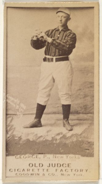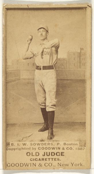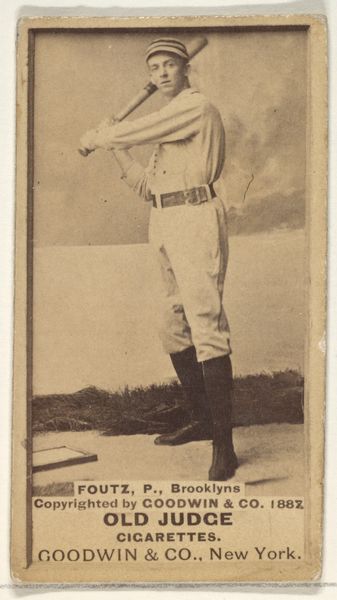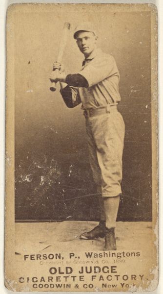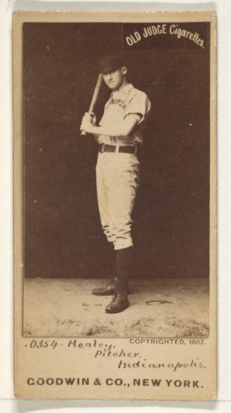 Editor: Here we have a portrait of William I. "Billy" Serad, a pitcher for the Toronto Canucks. It's an 1888 print made by Goodwin & Company for Old Judge Cigarettes. It has this sepia tone that lends the image an antique quality. What stands out to me is the way Serad is holding the bat, almost delicate. What do you see in this piece? Curator: What I see is a reflection of the intersection of commercial interests and the burgeoning culture of celebrity at the end of the 19th century. Tobacco companies used athletes' images to sell their products. Consider the gendered aspect of this image: tobacco consumption was coded masculine, and by associating their brand with strong athletes, the company reinforced those ideals. And we need to question that. Editor: That's a great point! I hadn't thought about the connection between smoking and the promotion of masculinity. So, the baseball player becomes a symbol for a certain type of man? Curator: Exactly! This is about constructing identity. Also, who had access to these images? How did they circulate within different communities? Considering that access, this portrait tells us so much about who was being included in popular culture at this time, and of course, who was being excluded. Editor: I see now. So it's not just a picture of a baseball player; it is a piece of a much larger societal narrative about gender and identity. Thank you for pointing that out! I learned a lot. Curator: It goes to show how something as seemingly simple as a baseball card can open up complex and relevant social and political issues!