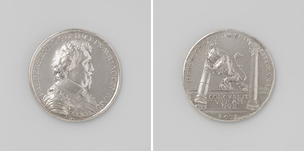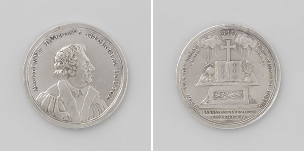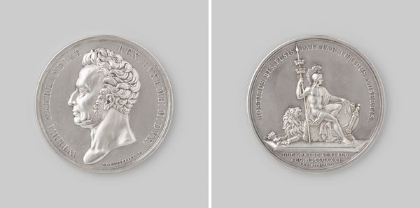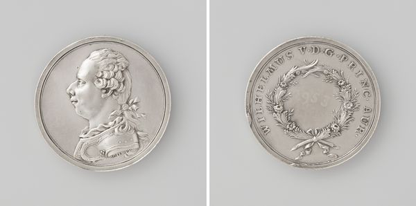 Editor: This object is a medal from 1702 by Martin Schmeltzing, commemorating Godard Ginkell, an Earl. It’s crafted from metal, probably silver, with engravings. I am immediately struck by how formal and idealized the portrait feels, and the back has a whole allegorical scene! What kind of symbolic language is at play here? Curator: Indeed! Notice how Ginkell is depicted in profile, adorned in armor and an elaborate wig. This consciously echoes classical portraiture conventions, immediately associating him with Roman emperors and military might. The portrait establishes him within a lineage of power and leadership. Editor: That's interesting, like visual propaganda? And what about the other side with the winged figures around that monument? Curator: Exactly! Consider the imagery on the reverse. We see bound figures flanking a victory monument. These are symbols loaded with cultural weight. Editor: What do they represent? Curator: The bound figures likely represent defeated enemies, serving to glorify Ginkell's military achievements and Dutch power. What feeling do you get from the placement of text on the victory monument? Editor: Hmm… it seems important! It separates the heavens – indicated by the flags and coats of arms at the top - from those figures in chains… it almost feels like a warning, to those defeated, below. It definitely adds a layer to how the medal is understood and is perpetuating its cultural memory! Curator: Precisely. Each of these symbols contributes to constructing and reinforcing Ginkell's image as a triumphant leader and upholder of Dutch authority. This object served as a tangible form of propaganda, circulating a specific narrative about power and victory. Editor: This exploration has really opened my eyes to how much these medals can communicate, going beyond a simple image of a historical figure. I learned how even something like a medal could act as propaganda, filled with complex layers of symbolism. Curator: Agreed. It underscores the power of images to shape historical narratives and solidify cultural memory.