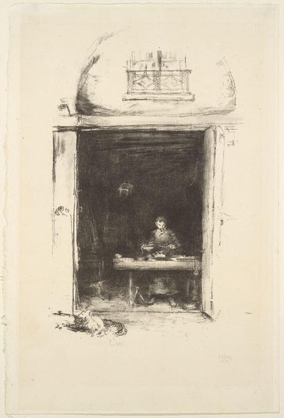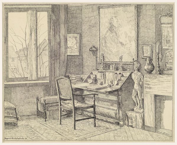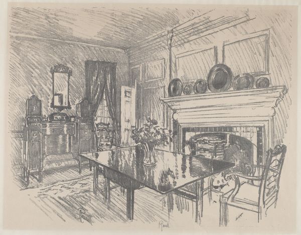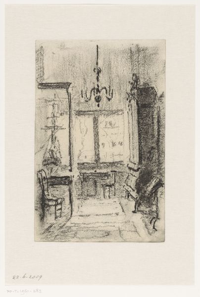 Editor: This is "Interior of the Office of Mr. and Mrs. R. Janssens, Avenue Molière" by René Janssens, dating from 1880 to 1936, made with charcoal. I am struck by how the artist captured the quiet stillness of the space, all with subtle shading. What do you see in this drawing? Curator: I note Janssens' sophisticated use of charcoal to delineate space and form. Observe the geometric framework that underlies the composition; the rectangles of the mirror and framed art, juxtaposed with the curvilinear details of the mantelpiece. It almost feels like a dance of geometry and curves. Editor: The soft quality of the charcoal creates such an inviting, peaceful effect. Can you talk about how the materials contribute to this feeling? Curator: Absolutely. Consider the nature of charcoal itself: its pliability allows for nuanced gradations of tone, creating depth and volume through contrasting light and shadow. See how the chair is grounded through deep and dark shadows, contrasting the flat application on the wall behind it. These types of contrasts lead the eye in, out and around the artwork. Editor: So it’s not just what’s depicted, but how the medium shapes the scene that's so impactful. I wonder, does this piece engage with specific stylistic elements? Curator: Undoubtedly. We see elements of Realism at play. However, the very visible charcoal strokes reject pure illusionism; rather, they foreground the materiality of the medium, almost verging towards the abstract, leaving room for open interpretations through compositional interplay. Editor: That’s fascinating – the blending of realism with abstraction! I'll certainly look at charcoal drawings differently now. Thank you! Curator: A fruitful dialogue. It is through this attentiveness to form and materiality that we apprehend a deeper understanding.