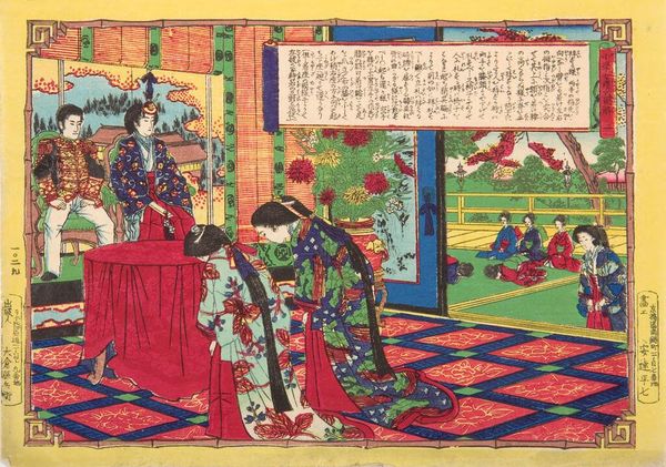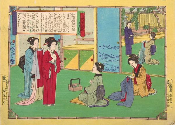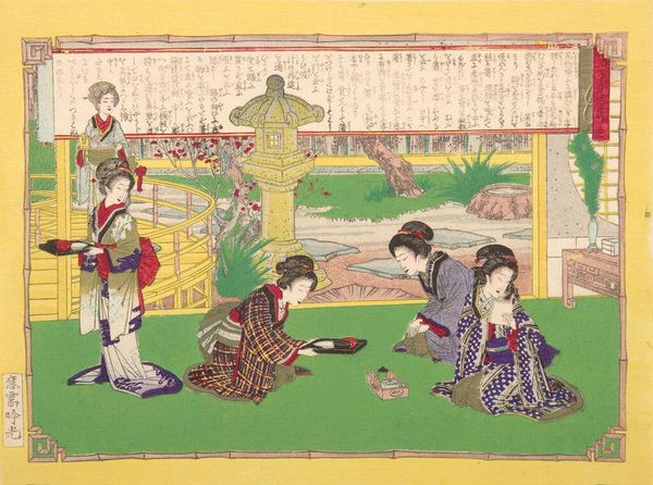 Editor: Here we have Katsukawa Shuncho's "Triptych: Courtesans," an undated woodblock print. I’m struck by the arrangement of figures and how they seem to exist both inside and outside. What symbols or meanings do you see in the composition? Curator: The triptych form itself is significant, calling to mind religious altarpieces and suggesting a reverence for the subjects. Note how the women are framed by architecture and nature, mirroring and reflecting each other. Do you see how the cherry blossoms suggest fleeting beauty? Editor: Yes, and the careful detail in their clothing seems to elevate their status, despite their profession. Curator: Exactly! Their stylized representation speaks to cultural ideals, presenting an idealized version of femininity and luxury. These are not just portraits, but cultural symbols, imbued with social and psychological weight. Editor: It’s amazing how much history and symbolism is packed into one image. I'll never look at a woodblock print the same way. Curator: Indeed. It is through these symbols that we glimpse a culture's dreams and aspirations.
